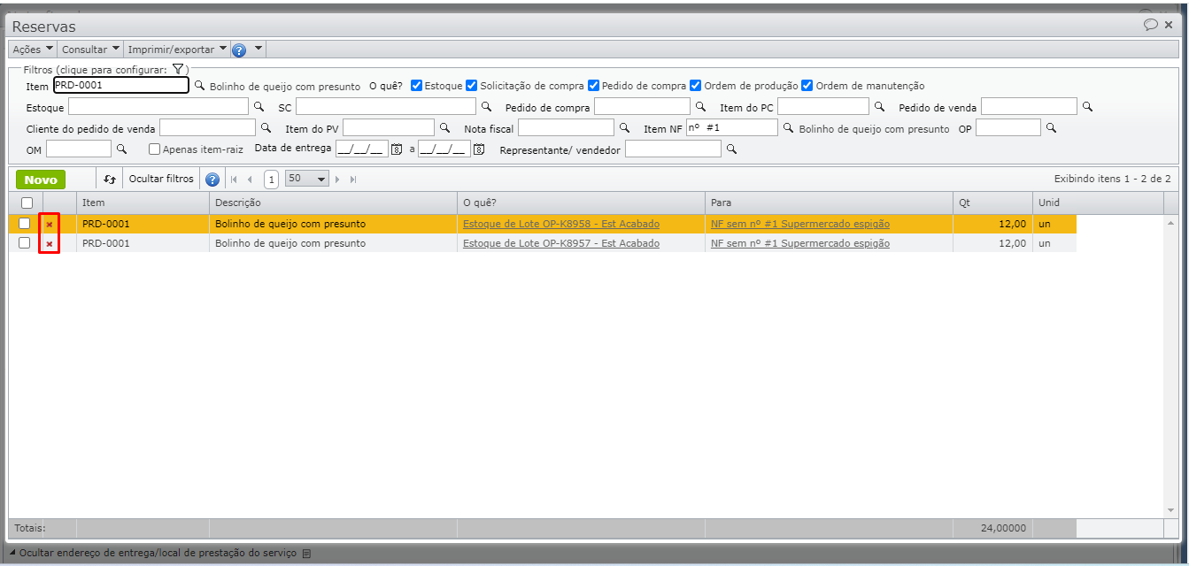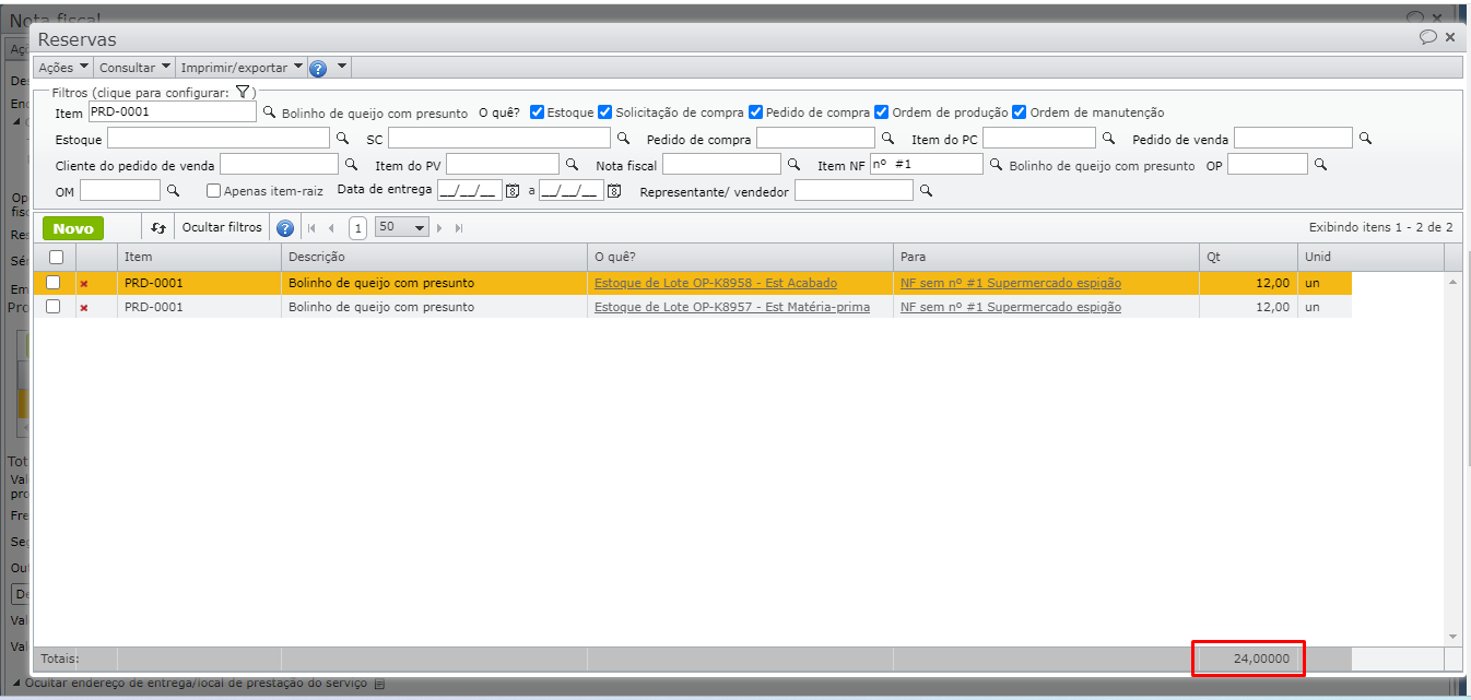 3) Na tela de reservas do item da NF, verifique que a quantidade total reservada do item da NF é superior à quantidade do item.