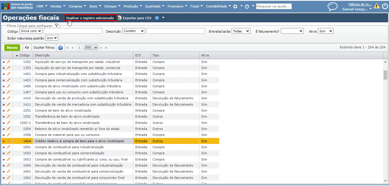 3) A seguir, selecione a operação fiscal mais próxima da que precisa e clique na opção “Duplicar o registro selecionado”.