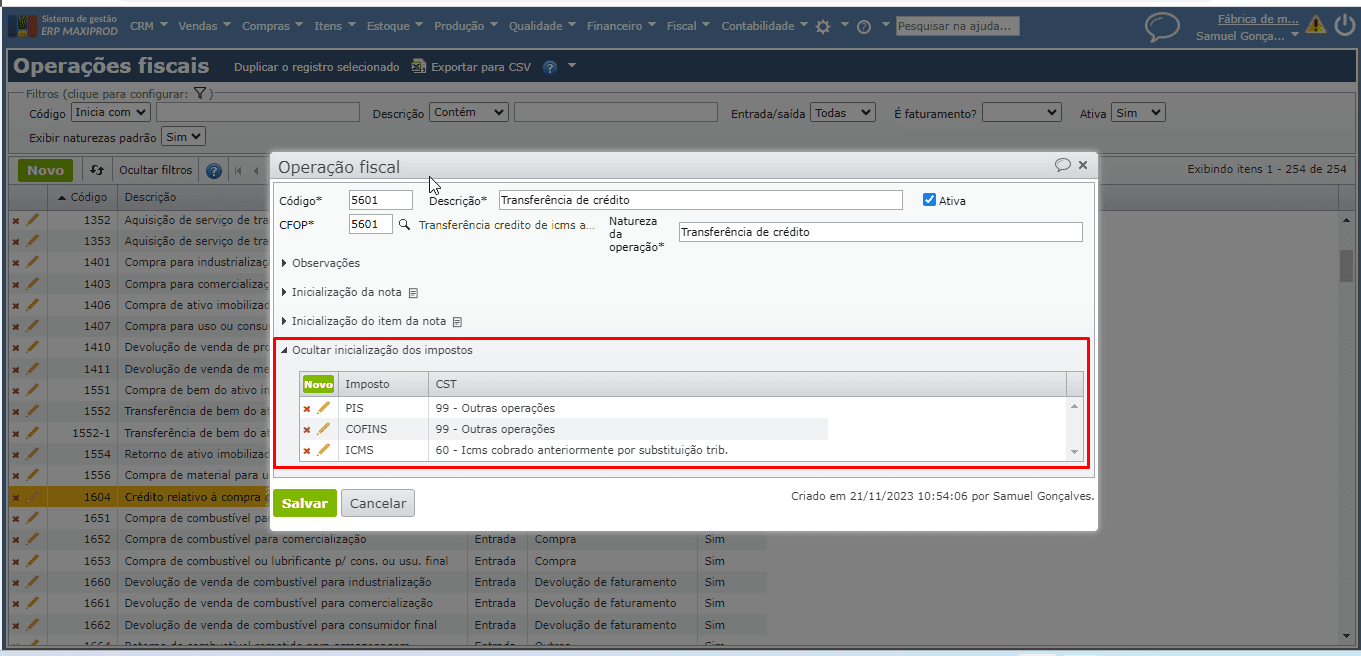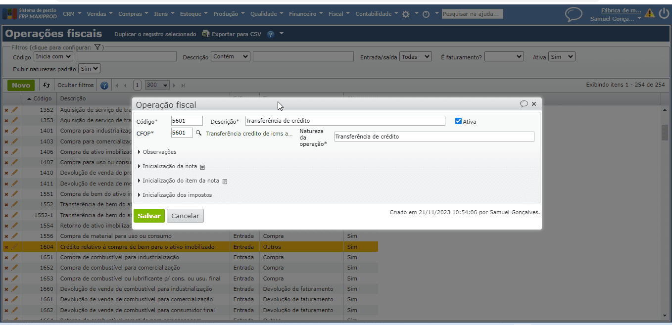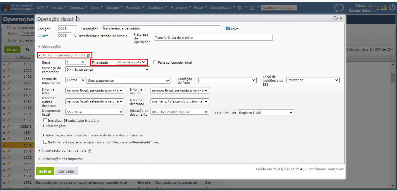 4) Na janela aberta, preencha o código da operação fiscal sendo criada (o código da operação fiscal é de livre preenchimento), informe a descrição, altere o CFOP se necessário, preencha a natureza da operação e configure a inicialização da nota, do item da nota e dos impostos. Para saber mais sobre operações fiscais, clique aqui.