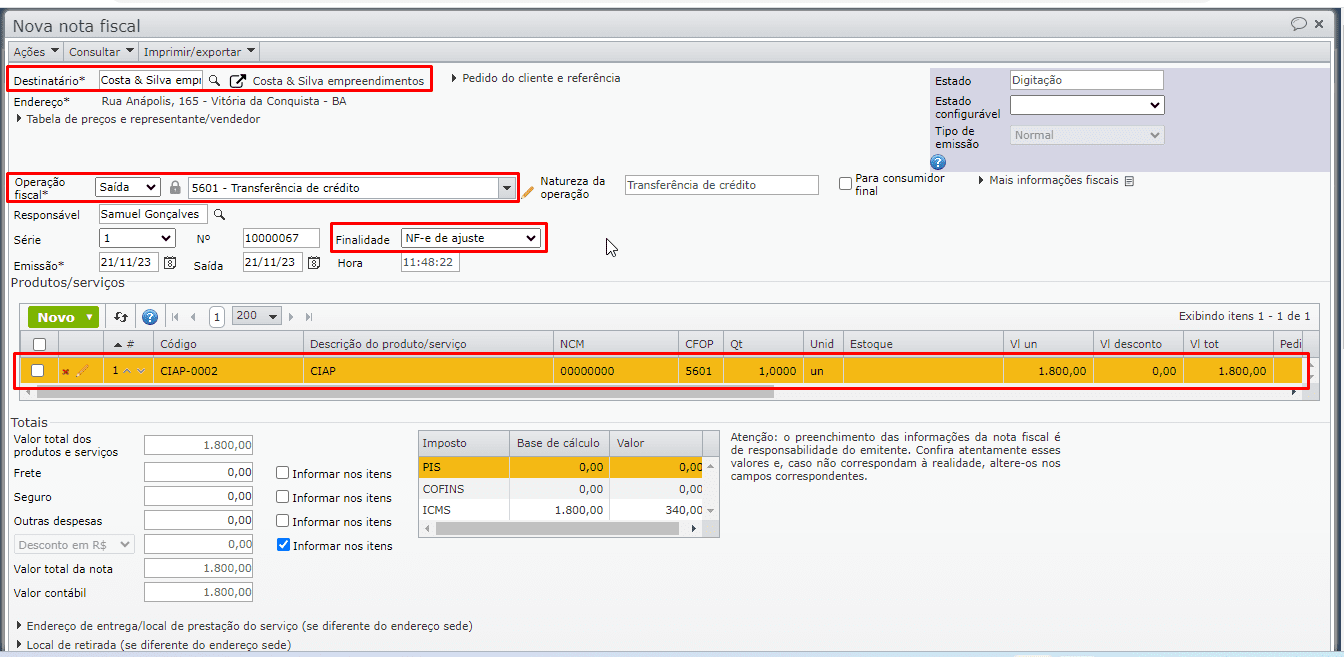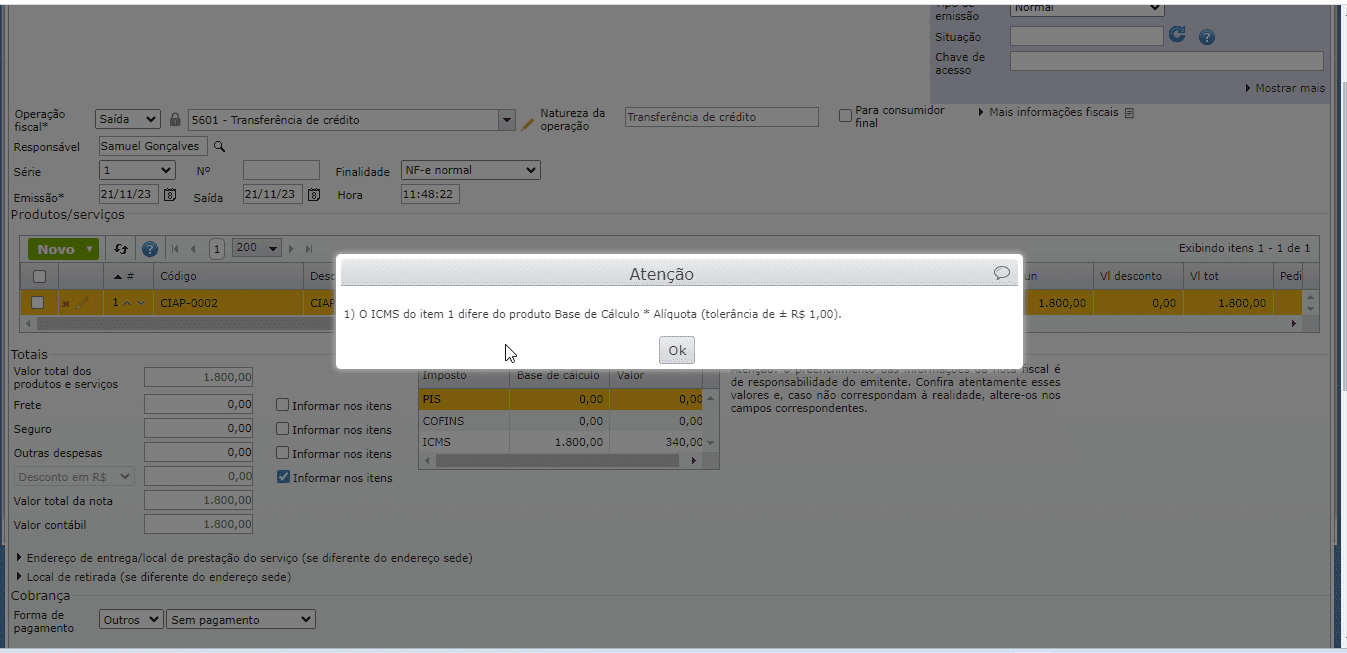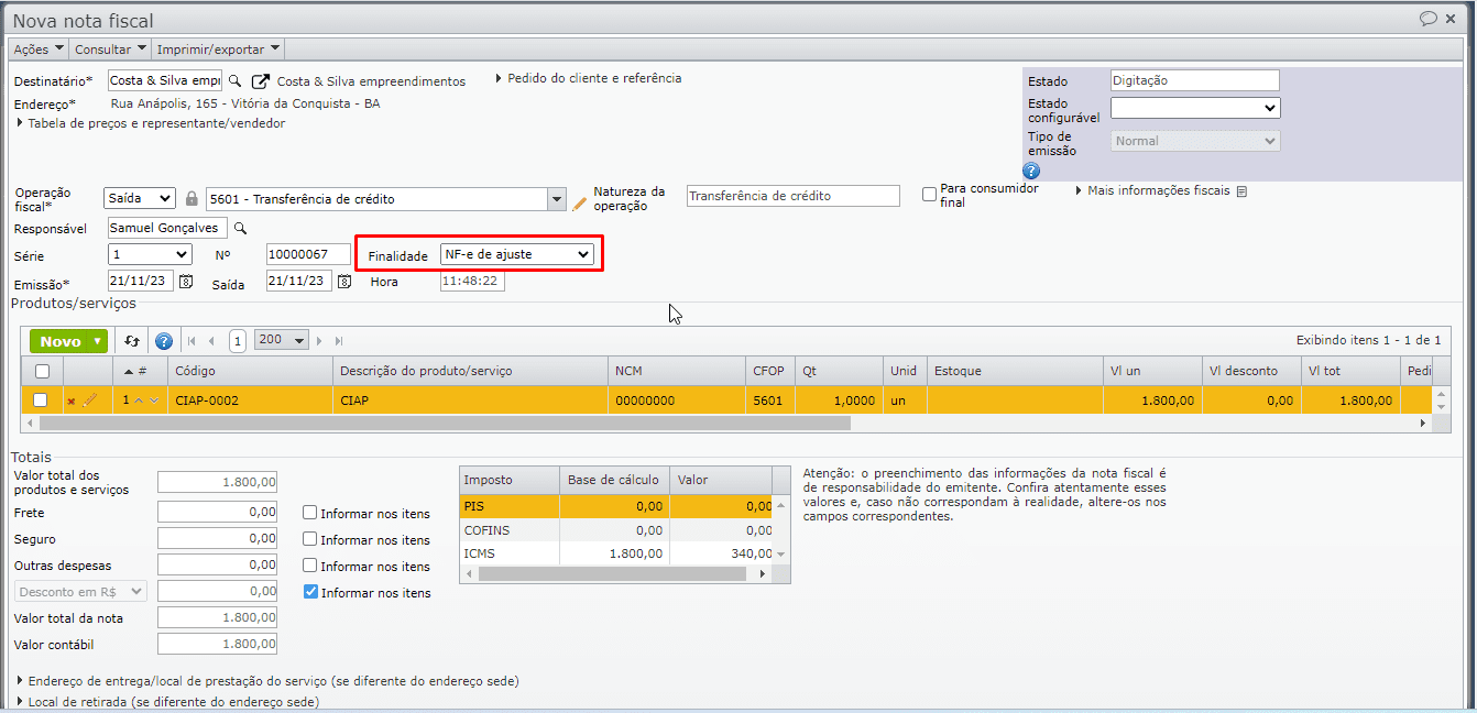 Se o valor informado como alíquota e base de cálculo do imposto estiverem corretos, apesar de não estarem dentro do esperado pelo cálculo, uma vez que se trata de uma nota fiscal de ajuste, altere a opção do campo “Finalidade” para “NF-e de ajuste” e a verificação deixará de impedir a emissão da nota fiscal.