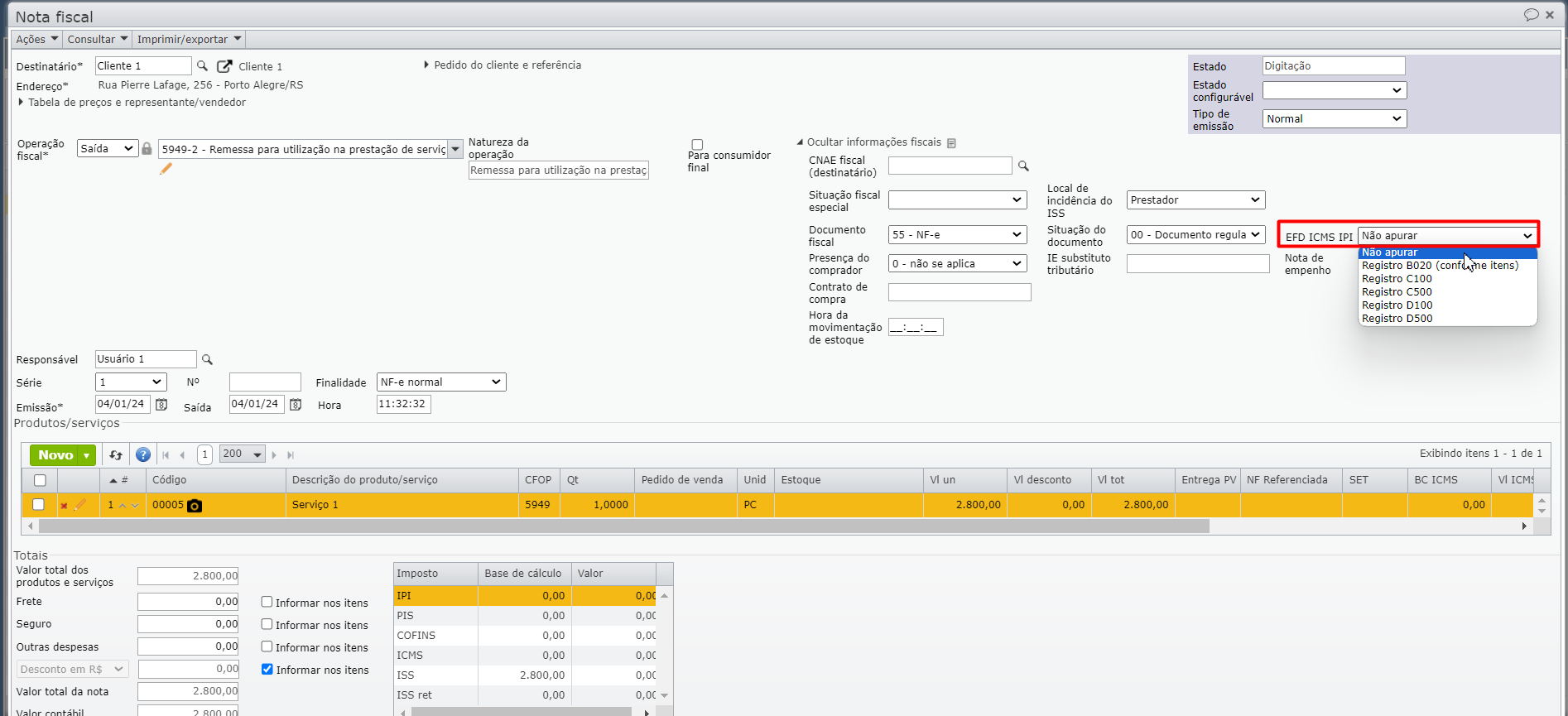 2) A seguir, selecione a opção “Não apurar” no campo “EFD ICMS IPI“.