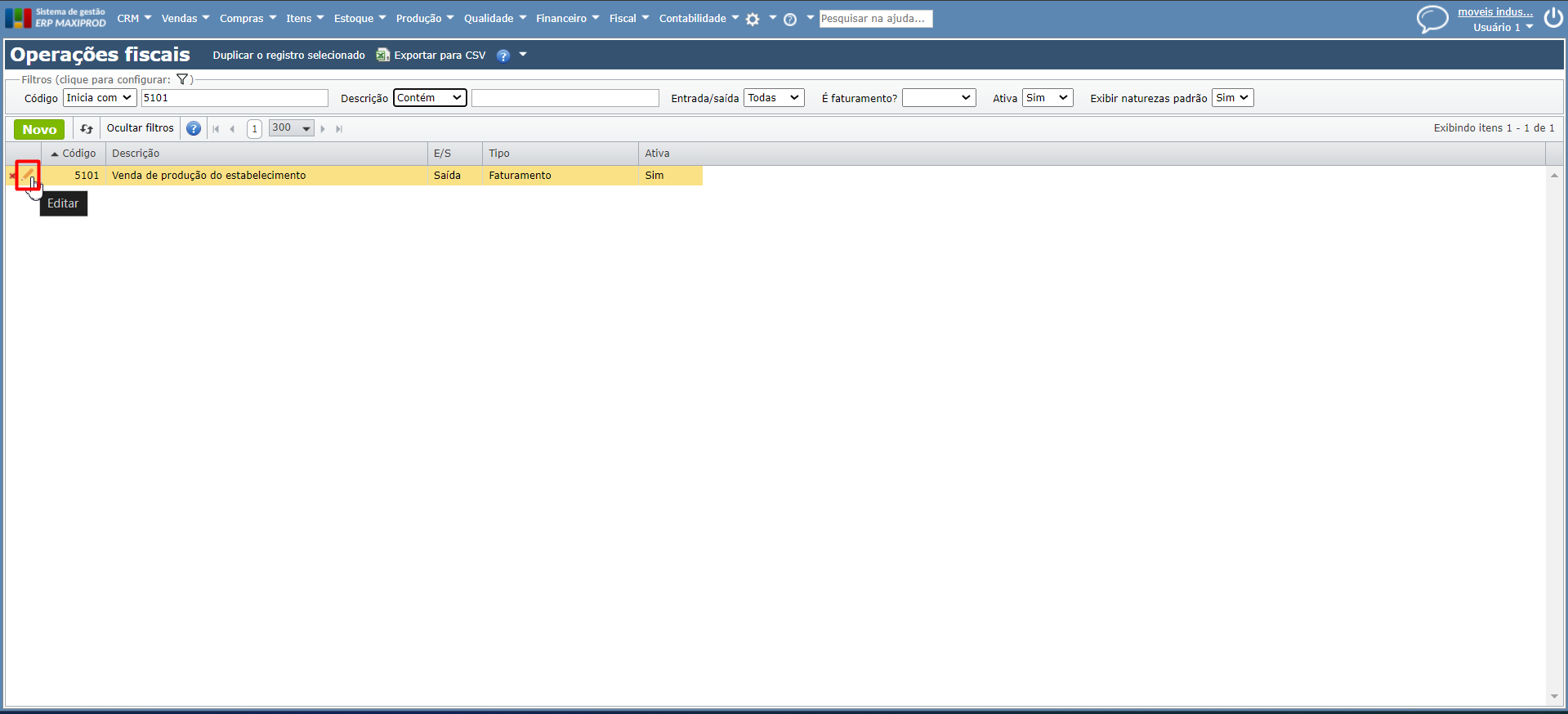 b) Procure a operação fiscal a alterar e clique no ícone “lápis laranja” para abrir sua tela de edição.