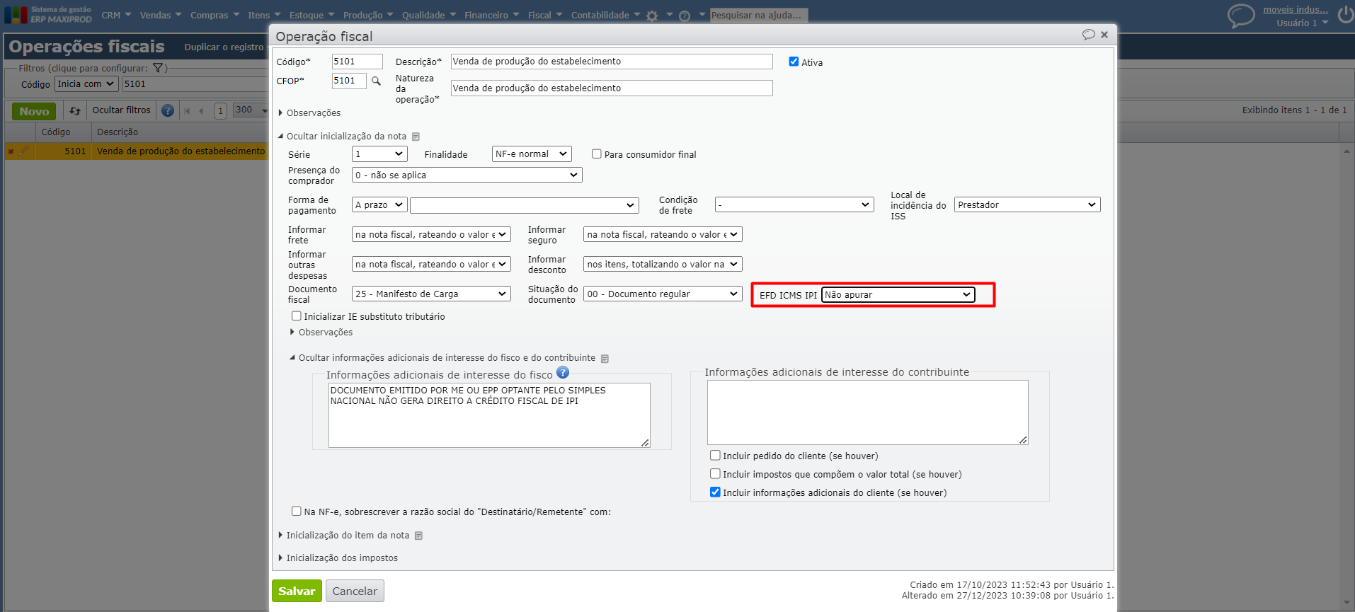d) Clique no botão verde “Salvar”. Assim, a configuração será aplicada às próximas NFs com esta operação fiscal, fazendo com que a NF não seja incluída no arquivo SPED.