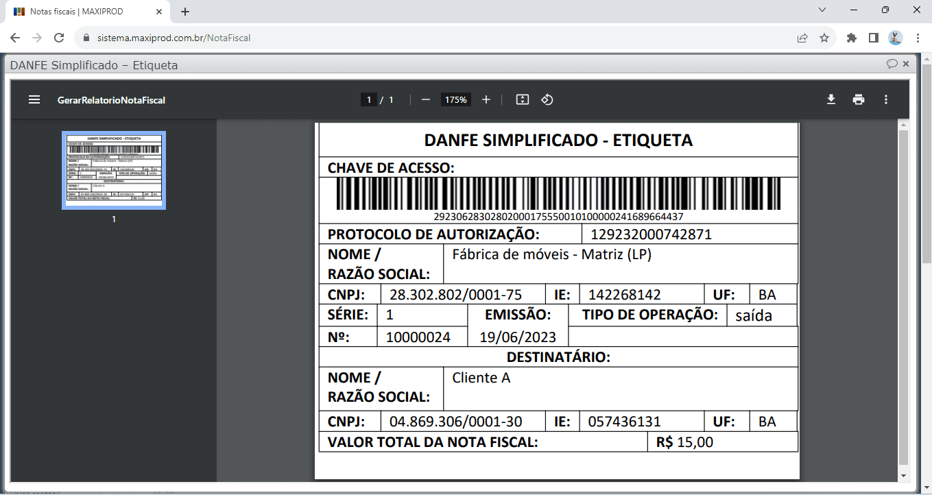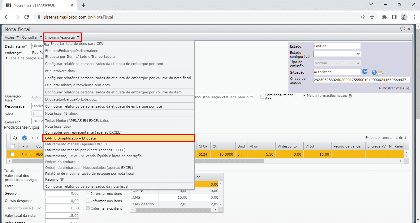 Para gerar o DANFE simplificado das notas fiscais, após a transmissão da nota para a Sefaz e conseguinte autorização de uso, estando na tela de edição da nota fiscal, acesse: