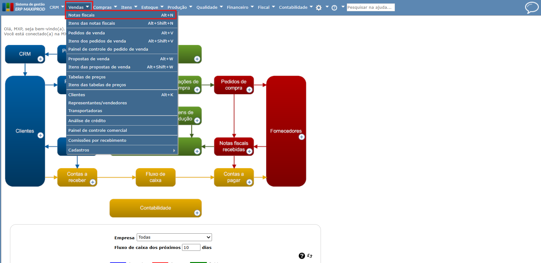 1) Acesse o menu superior “Vendas > Notas fiscais”.