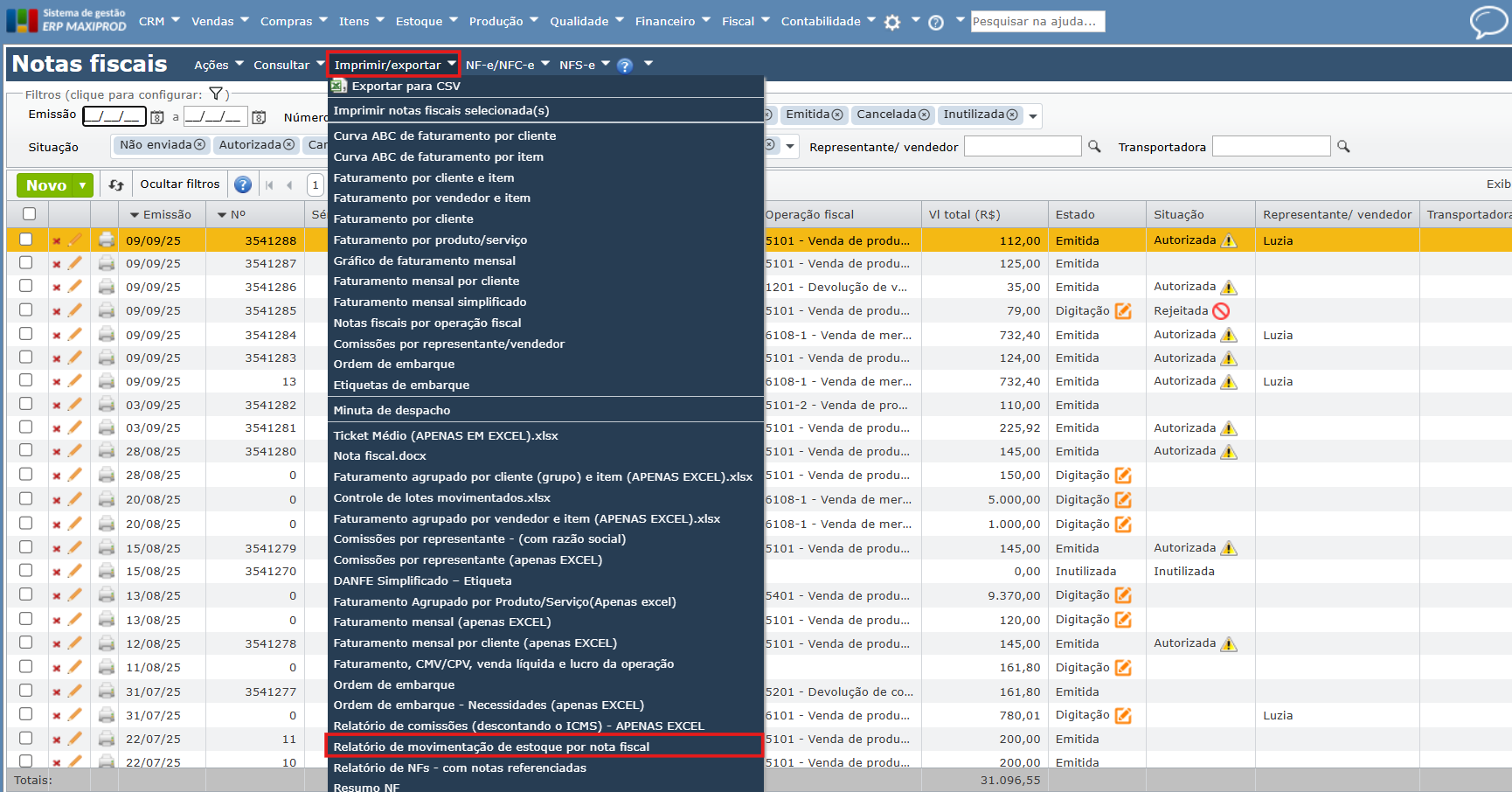 2) Clique em “Imprimir/exportar” e selecione a opção “Relatório de movimentação de estoque por nota fiscal”.