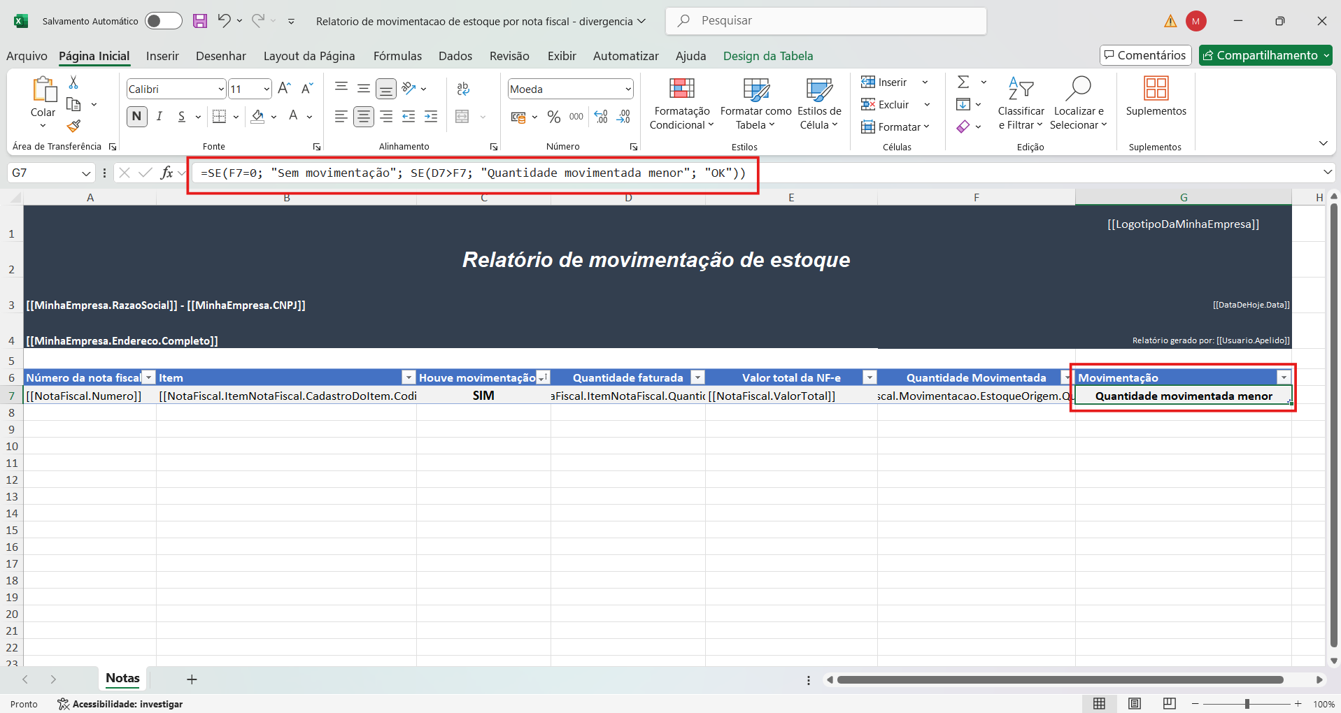 =SE(F7=0; “Sem movimentação”; SE(D7>F7; “Quantidade movimentada menor”; “OK”))