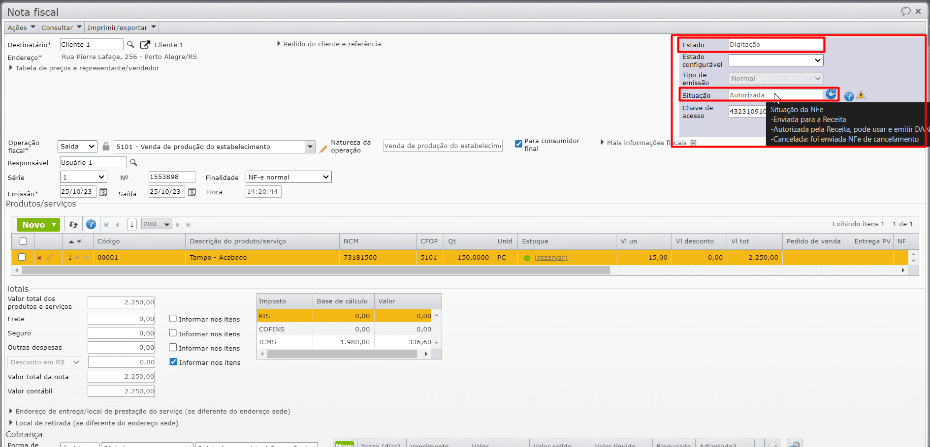 Observação: Também é possível faturar o pedido de venda dará origem a NF, através do menu “Vendas” > “Pedidos de venda” . Para mais informações, clique aqui.