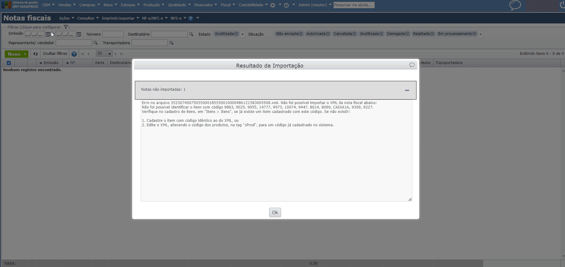 1) Os itens existentes no XML importado devem estar devidamente cadastrados no sistema, com os mesmos códigos do XML. Caso o item do XML não estiver cadastrado no sistema, ou estiver com um código divergente, é retornada uma mensagem de “Resultado da Importação” com botão “Ok“.