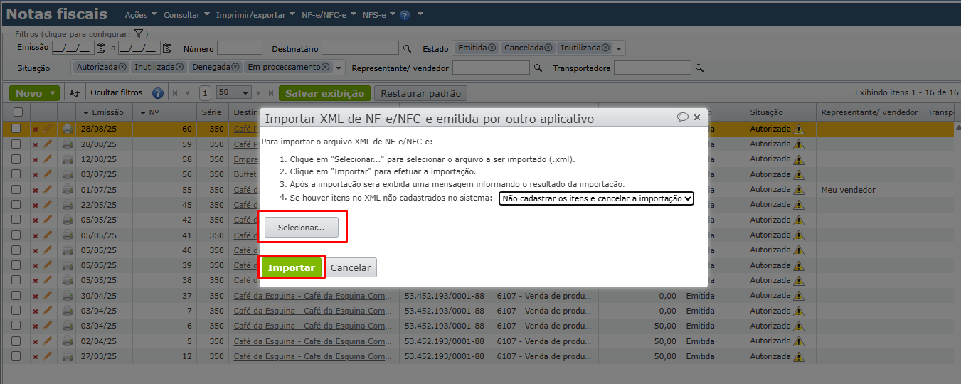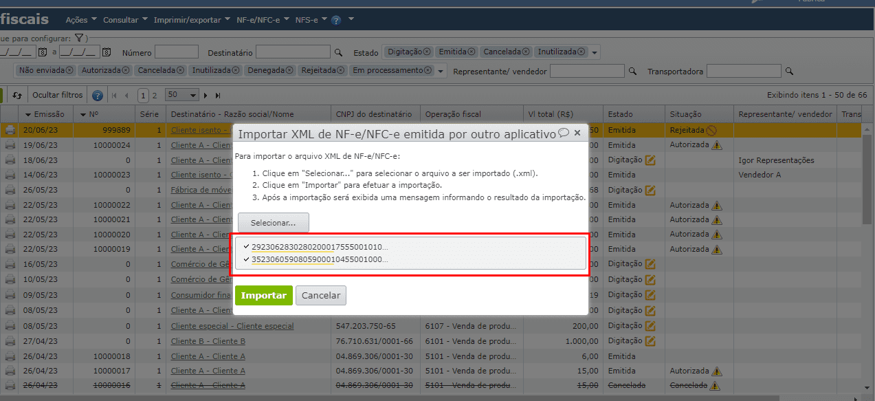Observação: É possível selecionar e importar vários XMLs ao mesmo tempo.