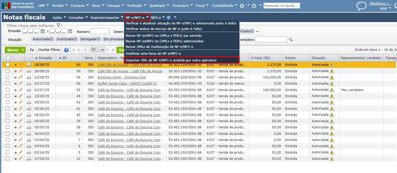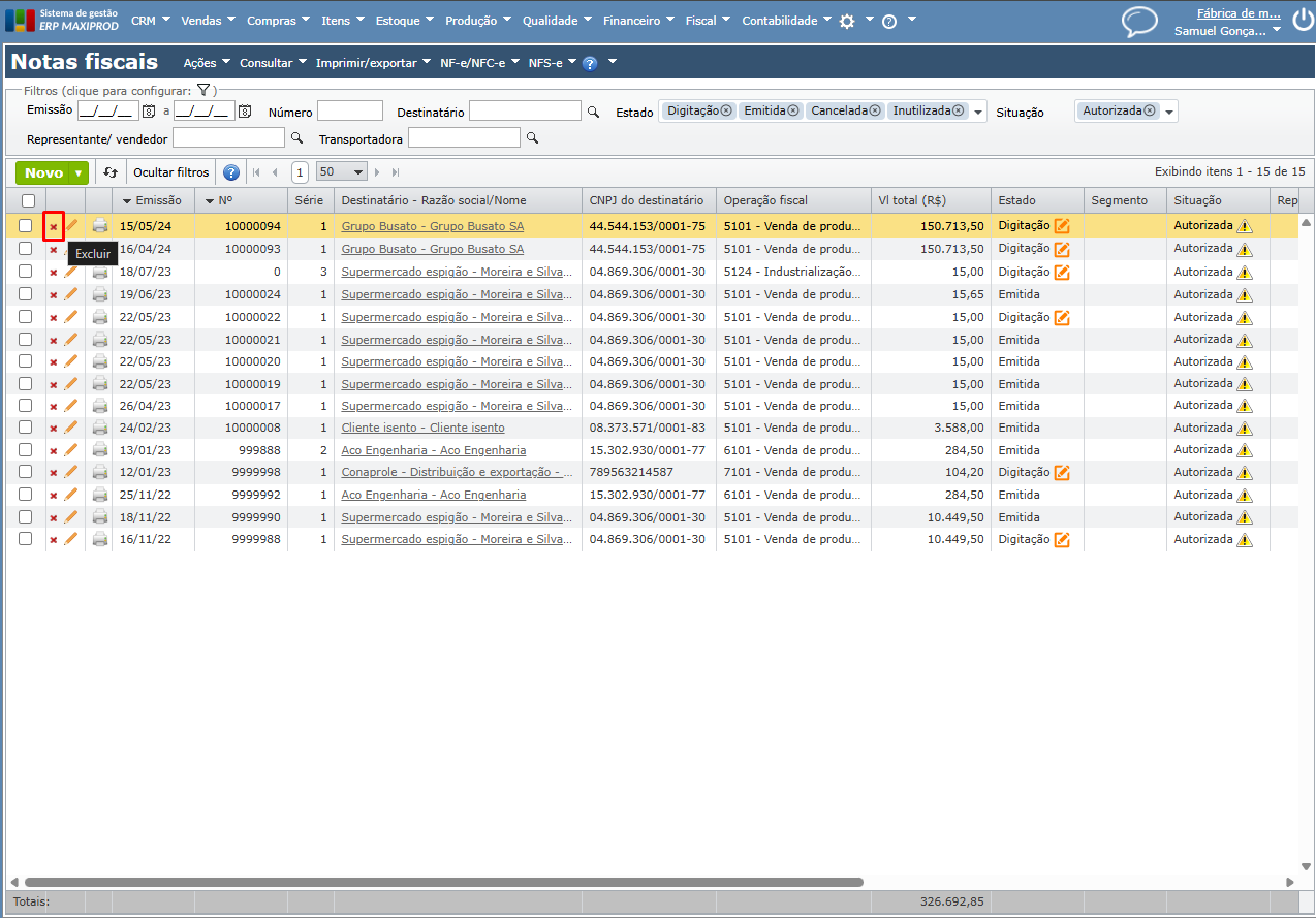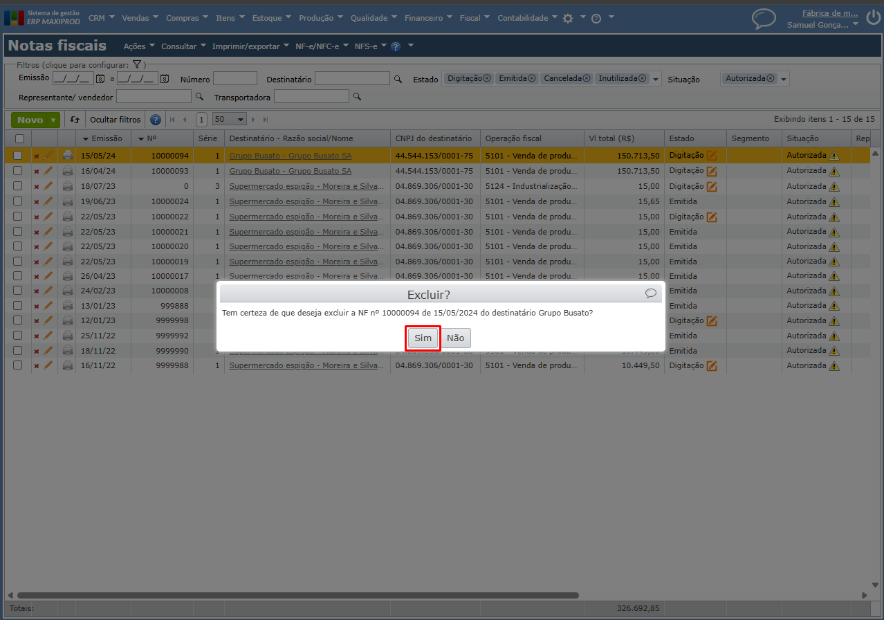 A exclusão de NF-es emitidas por outro aplicativo, importadas no ERP MAXIPROD, exige a permissão “NF022 – Excluir notas fiscais de saída com NF-e/NFC-e/NFS-e autorizada em ambiente de produção”. O motivo é que a NF-e mesmo tendo sido importada pelo XML, tem a situação “Autorizada”, ou seja, chegou a ser transmitida, ainda que por outro sistema.