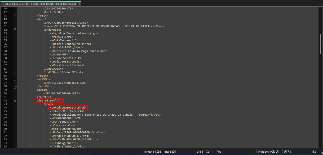 2. Edite o XML, alterando o código dos produtos, na tag “cProd”, para um código já cadastrado no sistema.”