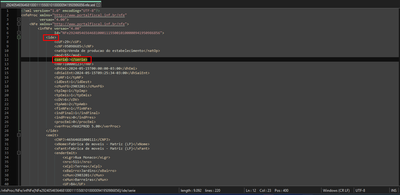 1) A série fiscal presente no XML fica na tag “<serie>” no grupo “<ide>”.