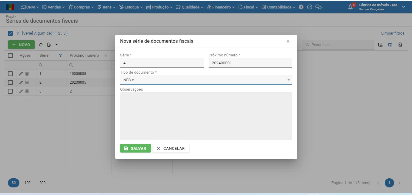 c) Na nova janela aberta, preencha os dados referentes à nova série de notas fiscais: série, próximo número, tipo de documento e adicione observações, se houver. Clique no botão verde “Salvar” para concluir o cadastro.