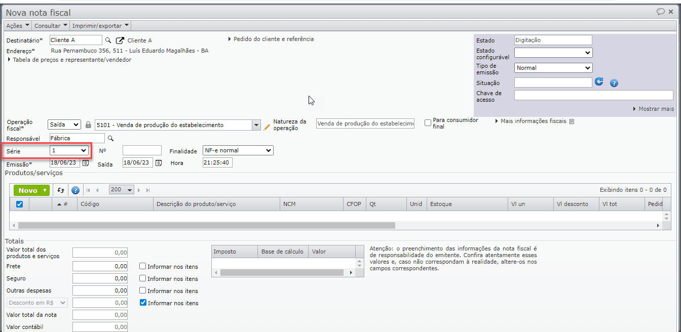 3) No momento da emissão da NF no ERP MAXIPROD, não esqueça de conferir atentamente a série fiscal informada, pois caso tenha sido criada uma nova série para esta finalidade, é preciso alterar antes de emitir.