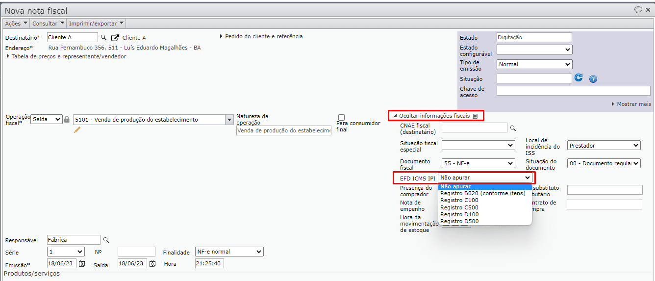 Observação: Este campo é inicializado pela operação fiscal, portanto, caso houver necessidade de definir um preenchimento automático, faça-o através da operação fiscal. Para saber mais sobre operações fiscais, clique aqui.