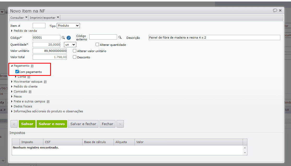 6) Para situações em que o módulo financeiro do ERP MAXIPROD não está sendo utilizado, e com isso planeja emitir a NF sem gerar títulos, desmarque a opção “Com pagamento” na edição do(s) item(ns) da nota. Para mais informações, clique aqui.
