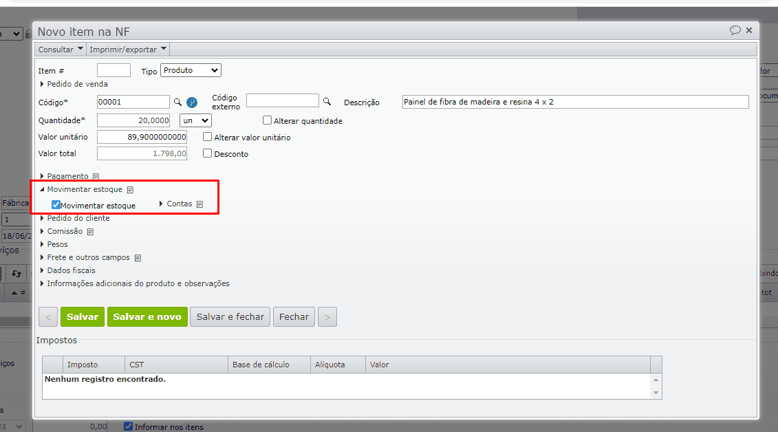 Observação: A configuração de movimentação de estoque e financeira é por padrão inicializada conforme a operação fiscal. Caso a NF-e não deva gerar movimentações de estoque, clique aqui. Por outro lado, se a NF não deva gerar títulos ou movimentações financeiras, clique aqui.