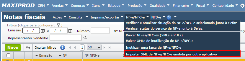 No ERP MAXIPROD, as movimentações de estoque e os títulos no financeiro são gerados automaticamente no momento da emissão das notas fiscais. Portanto, quando por algum motivo o usuário ainda emite notas fiscais por meio de outro sistema, é comum surgir a necessidade de lançar estas notas no ERP MAXIPROD.