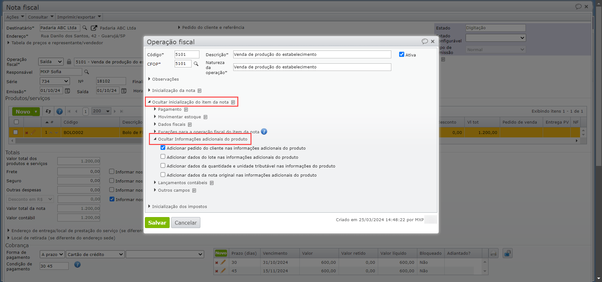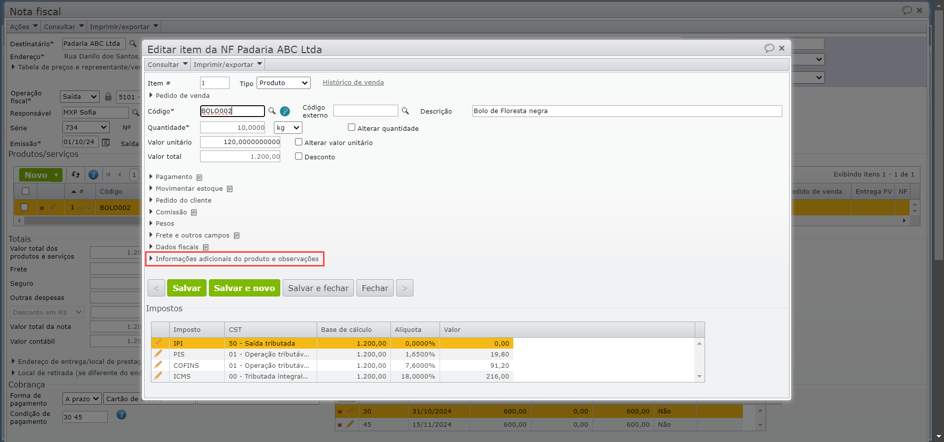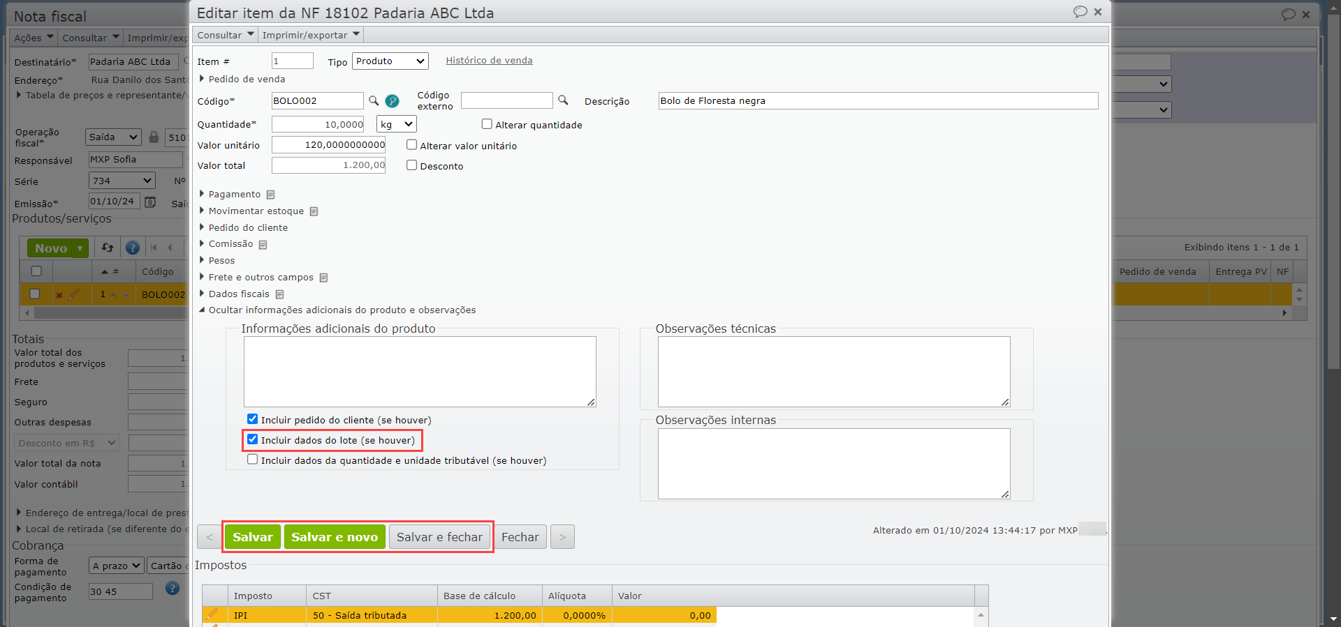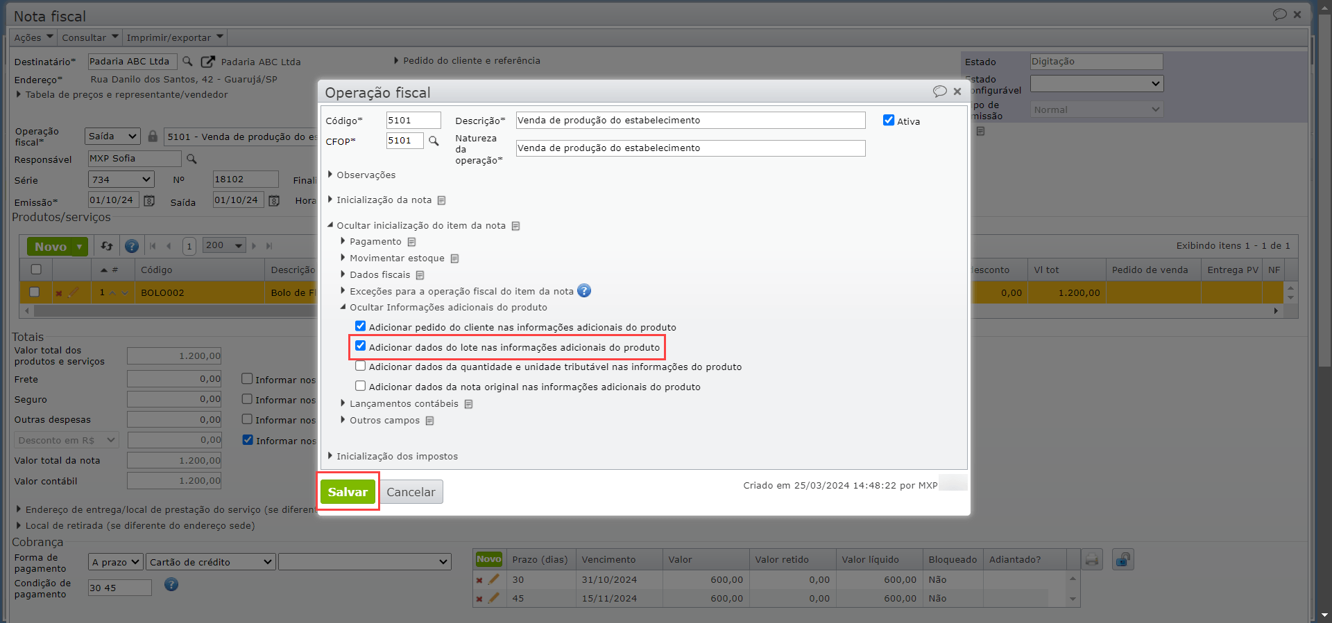 As próximas NFs, nas quais for utilizada esta operação fiscal, inicializarão com o parâmetro “Adicionar dados do lote nas informações adicionais do produto” marcado.