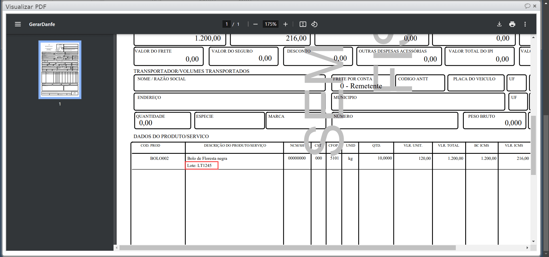 5) A pré-visualização (espelho) do DANFE, antes mesmo da nota ser emitida, mostrará se os dados do lote foram incluídos na descrição.
