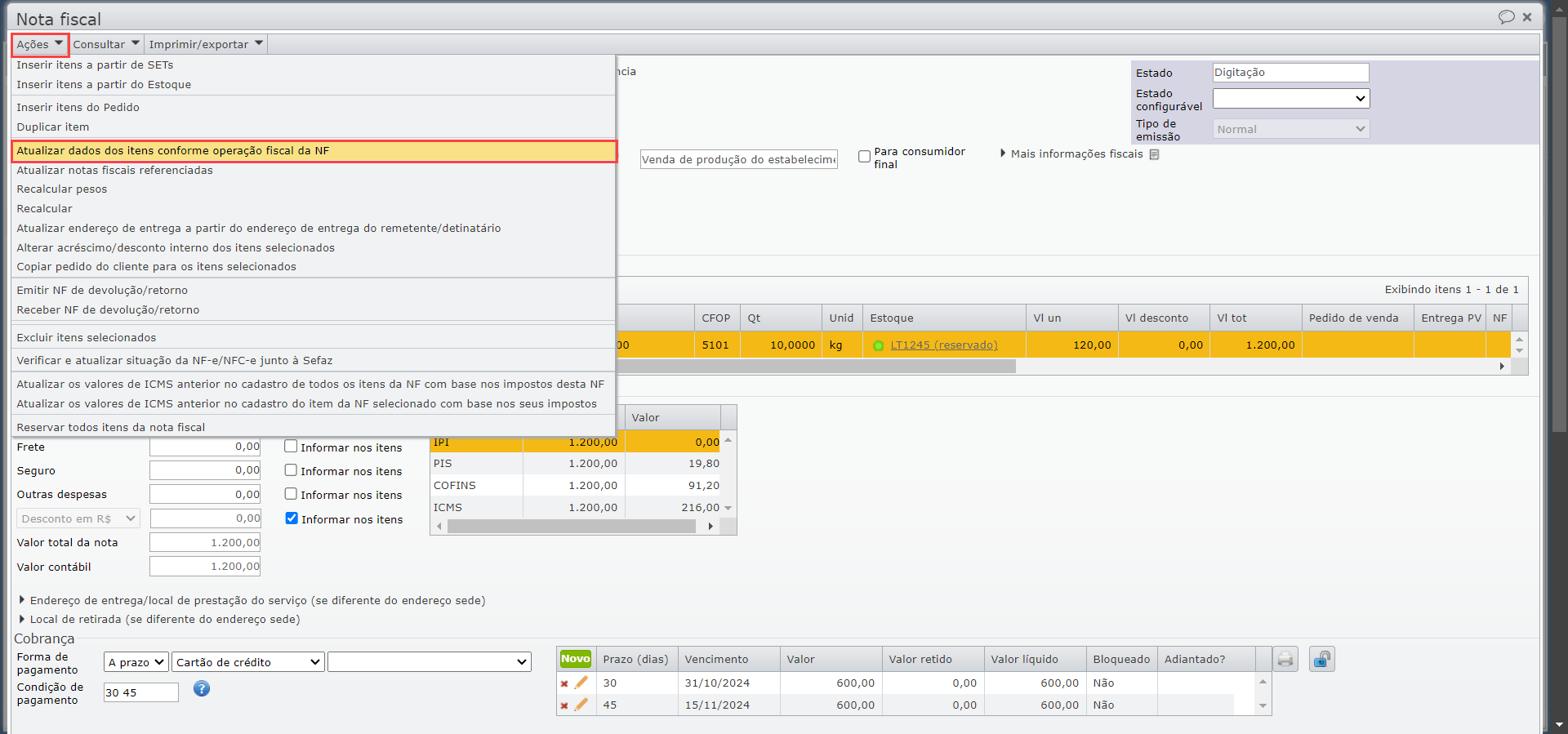 4) Para incluir os dados em uma NF, clique no menu “Ações > Atualizar dados dos itens conforme operação fiscal da NF”.