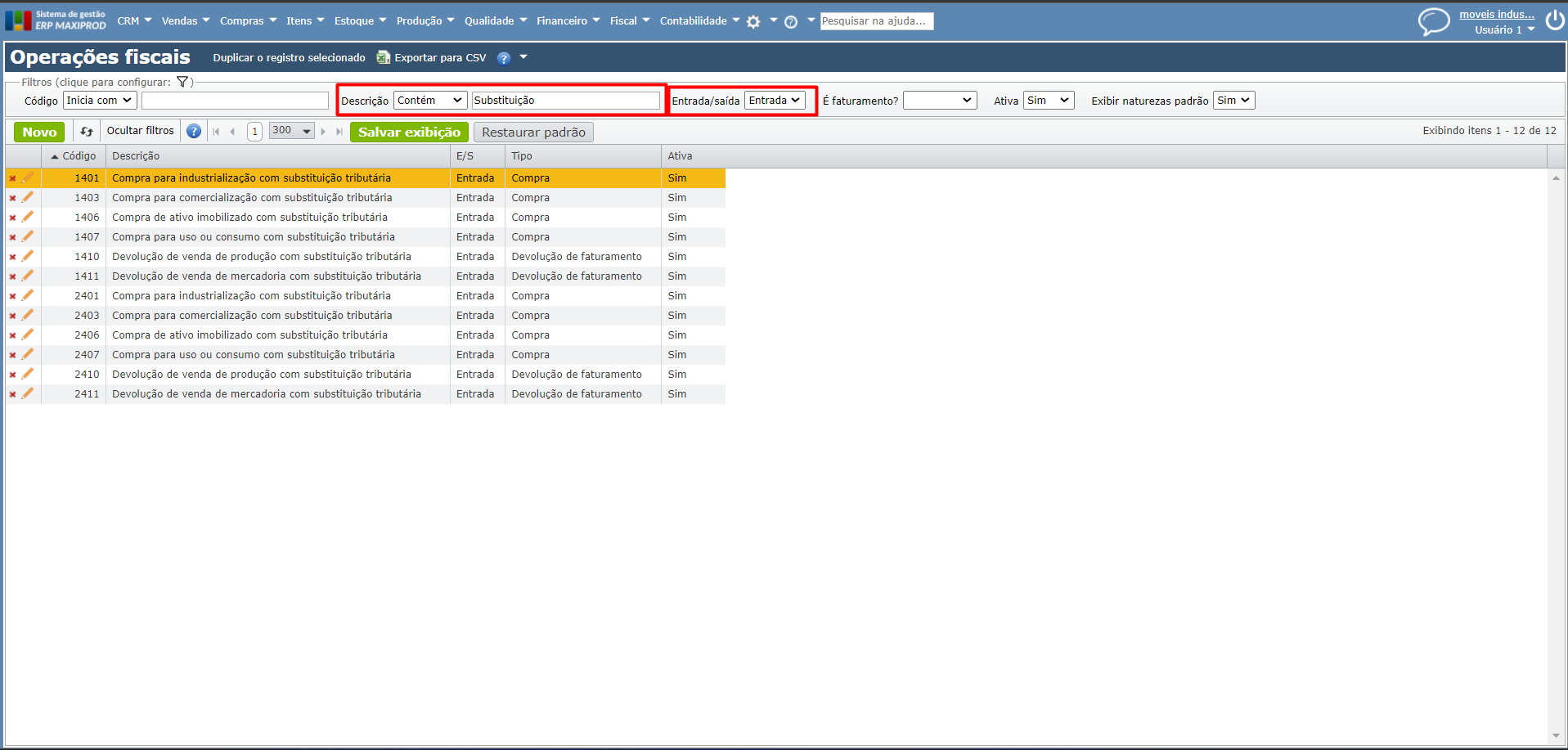 2) A seguir, procure a operação fiscal a alterar. Uma alternativa é selecionando “Entrada” no filtro “Entrada/saída”: em “Descrição” selecione “Contém” e insira a descrição “Substituição” no filtro. Dessa forma, apenas operações de entrada, com “Substituição” (referindo-se a substituição tributária) em sua descrição serão retornadas.