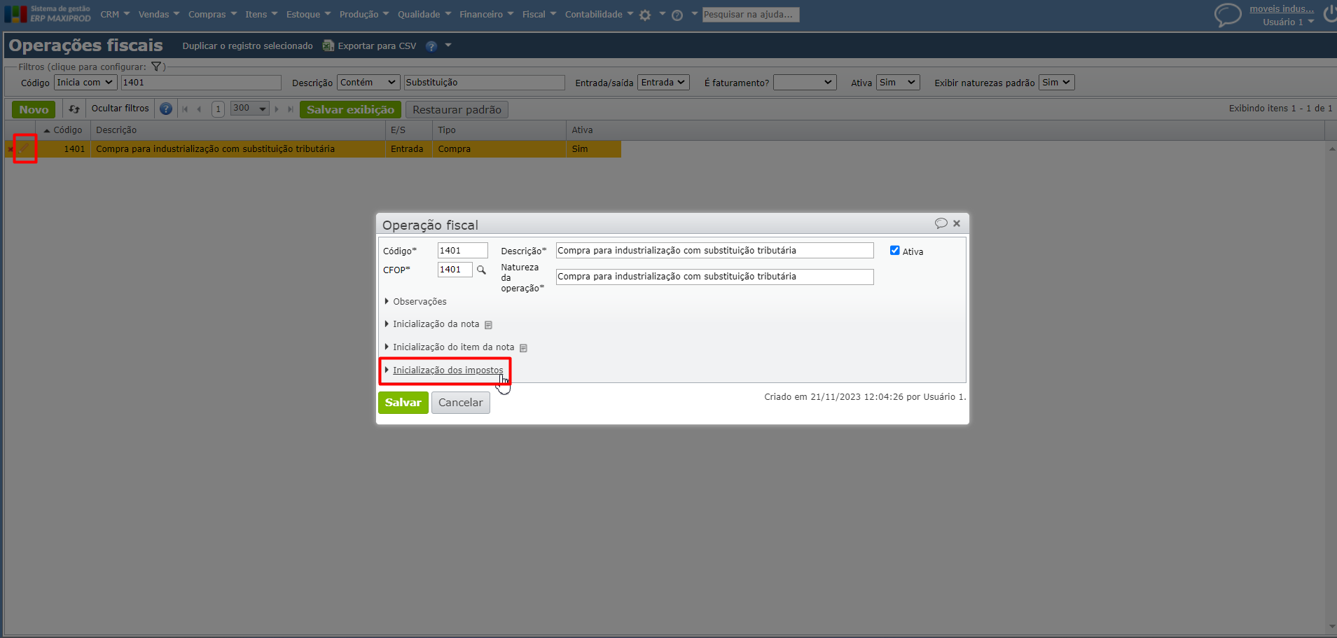 3) Após encontrar a operação fiscal a alterar, clique no ícone “lápis laranja” para abrir sua tela de edição, e clique na seção “Inicialização dos impostos”.