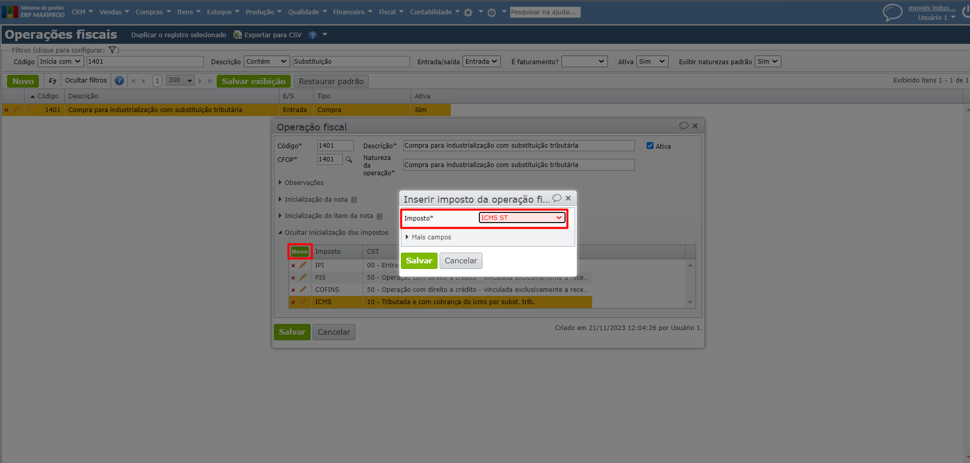 4) Se o imposto “ICMS ST” não estiver inicializado, clique no botão verde “Novo” e selecione “ICMS ST”.