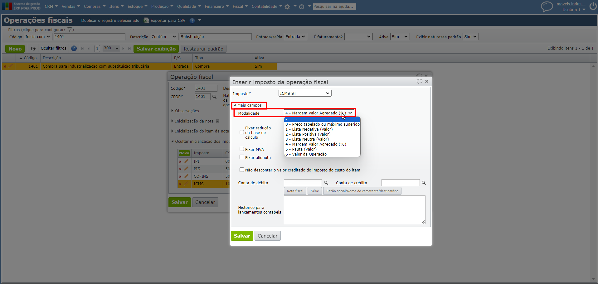 3) Clique na aba “Mais campos”, selecione a modalidade “Margem de Valor Agregado” e insira a porcentagem em “MVA”. Após inserir a porcentagem, o valor é automaticamente calculado, considerando a base de cálculo do imposto.