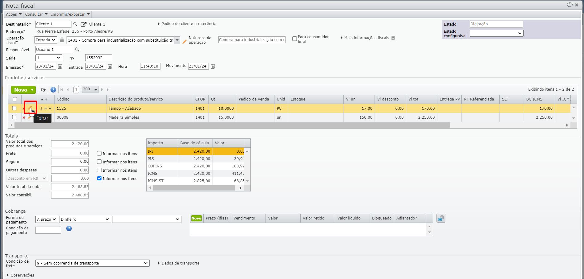 1) Na tela de edição da NF, clique sobre o ícone “lápis laranja” do item, para abrir sua edição.