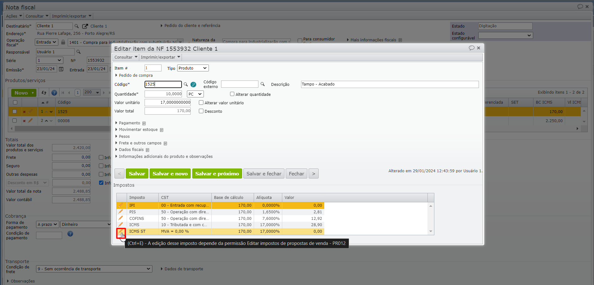 2) A seguir, clique no ícone “lápis laranja” do imposto ICMS ST.