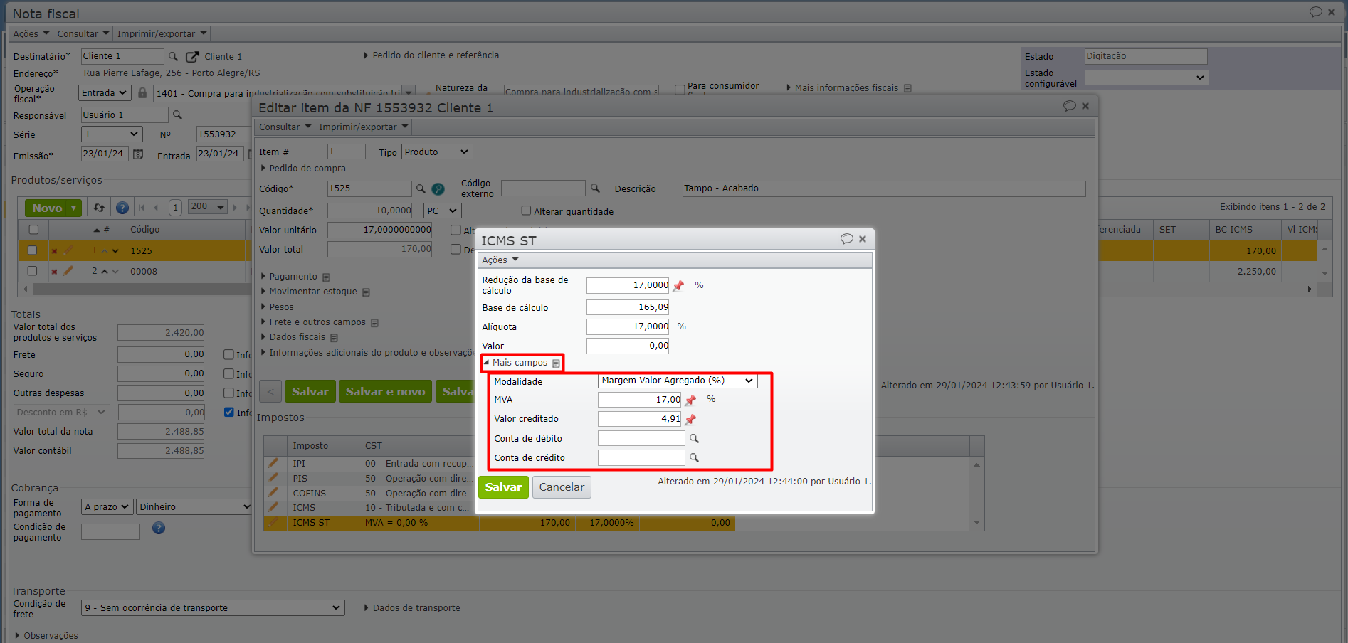 d) Após concluir o preenchimento, pressione o botão verde “Salvar”. Desta forma, quando um item for adicionado à NF e atender os critérios do cadastro da MVA (NCM, CEST, UFs de origem e destino), a alíquota de MVA registrada será automaticamente aplicada à sua base de cálculo do ICMS ST.