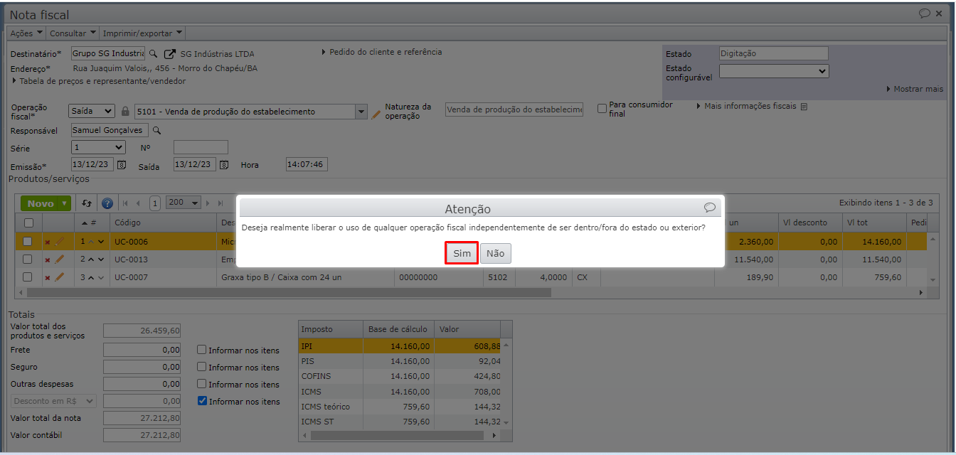 “Deseja realmente liberar o uso de qualquer operação fiscal independentemente de ser dentro/fora do estado ou exterior?”