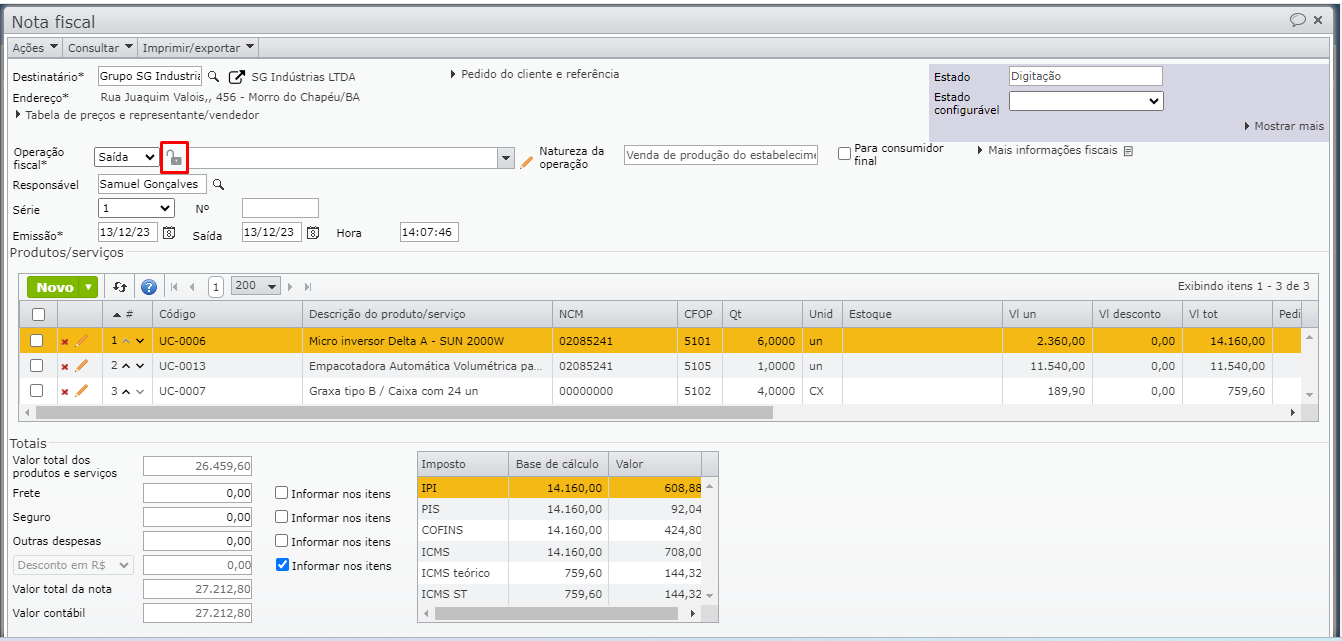 4) Quando o sistema passa a exibir o ícone do cadeado aberto, significa que a validação da operação fiscal dentro/fora do estado ou exterior deixou de existir para aquela proposta, cotação, pedido de venda, pedido de compra ou nota fiscal.