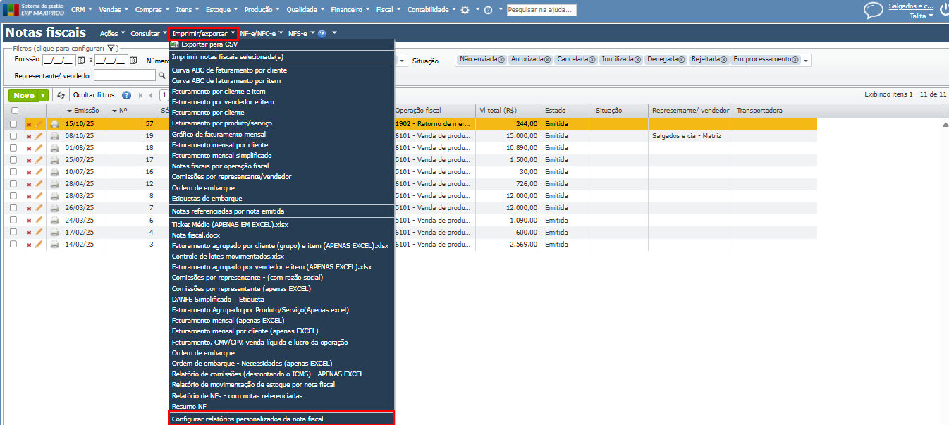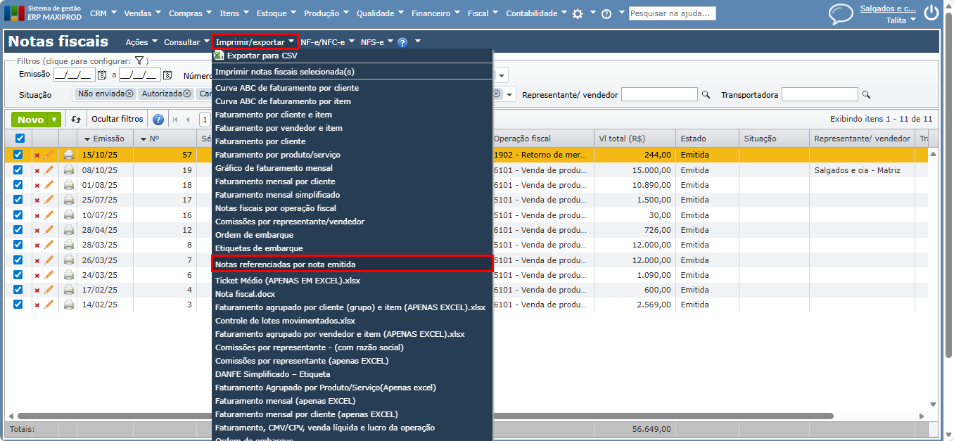 3) Acesse a opção “Imprimir/exportar”. Em seguida, selecione o relatório importado, neste exemplo, o relatório possui a descrição “Notas referenciadas por nota emitida”.