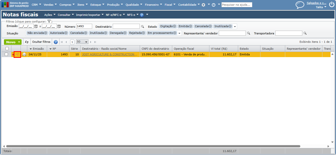 1) Acesse a NF que está realizando a referência e clique no ícone de lápis para editar.