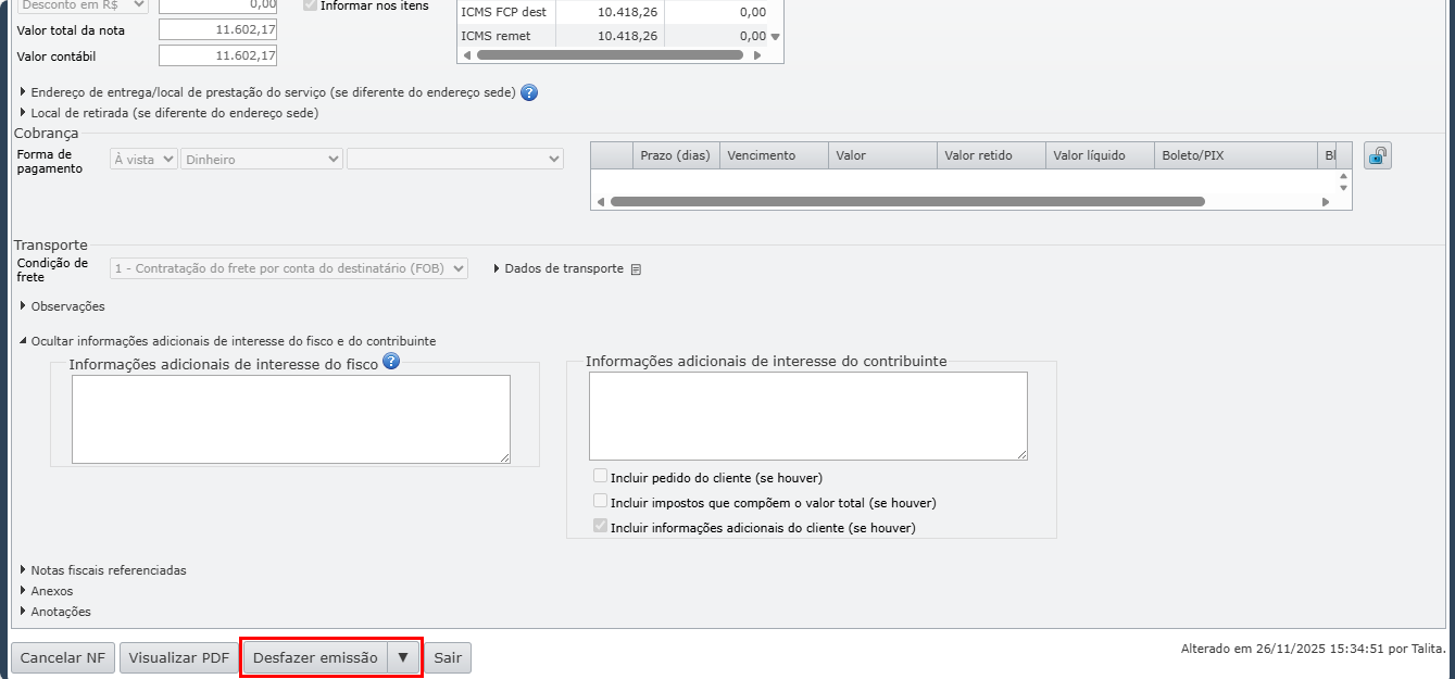 2) Caso seja uma nota fiscal emitida, clique no botão cinza “Desfazer emissão”. Caso seja uma nota fiscal recebida, clique no botão cinza “Desfazer recebimento”.