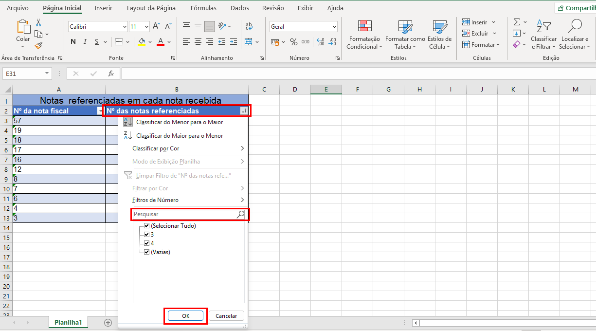 5) Abra o arquivo Excel gerado. Na coluna “Nº das notas referenciadas”, clique no ícone de seta e, na barra de pesquisa, informe o número da NF que deseja consultar (a nota que pode estar sendo referenciada por outras). Em seguida, clique no botão cinza “OK”.