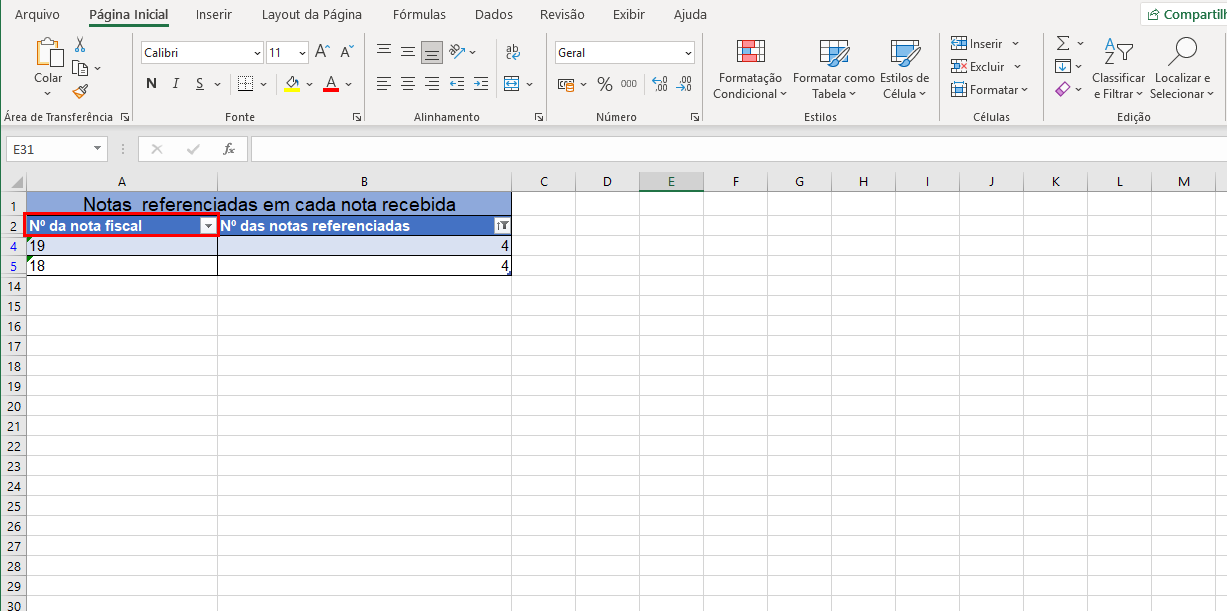 6) Na coluna “Nº da nota fiscal”, será exibido o número da NF que está referenciando a nota buscada. Neste exemplo, a NF de número 4 está referenciada nas notas de número 18 e 19.