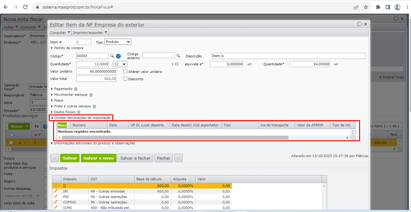 2) Expanda a seção “Declarações de importação” e clique no botão verde “Novo” para criar a declaração de importação do item.