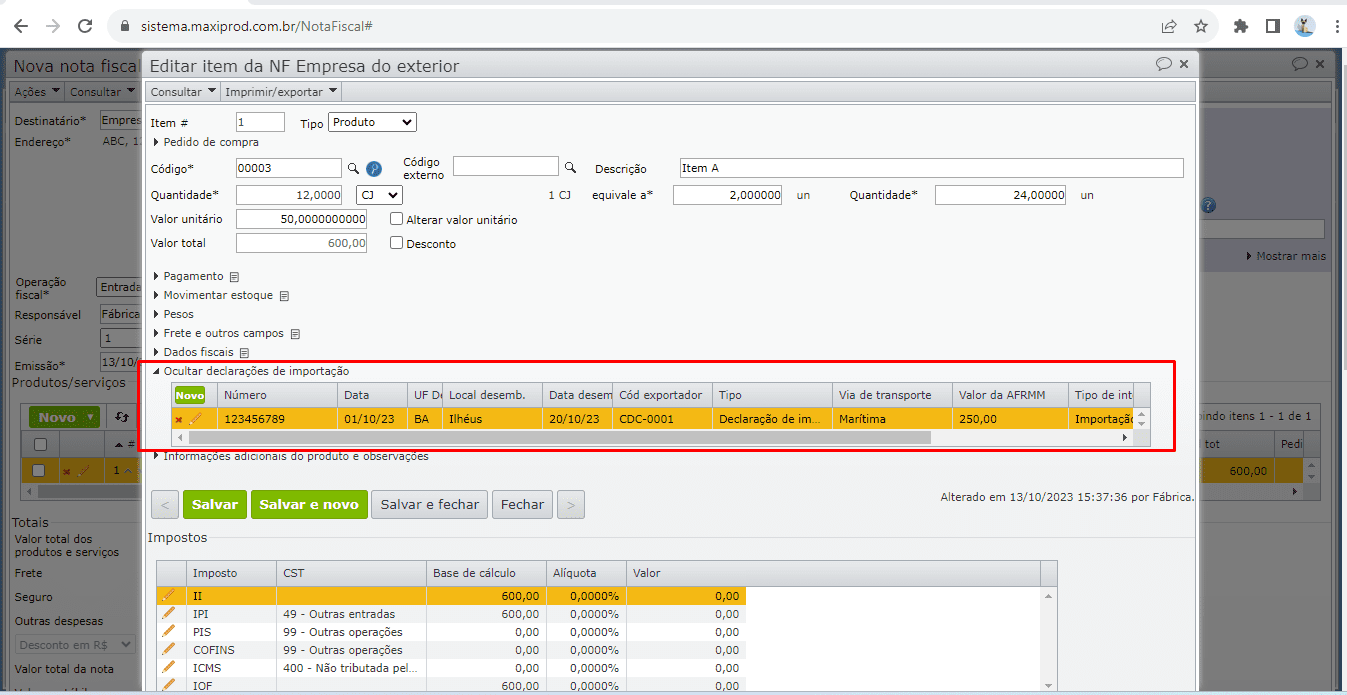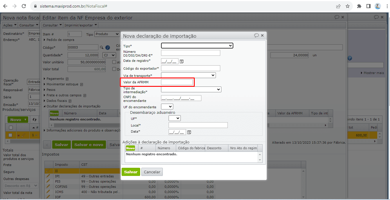 1) Nas notas de importação, o usuário pode informar o valor da AFRMM de cada item da nota. Para isso, ao utilizar corretamente a operação fiscal que corresponda a importação, será exibida na edição dos itens da nota a seção “Declarações de importação”.