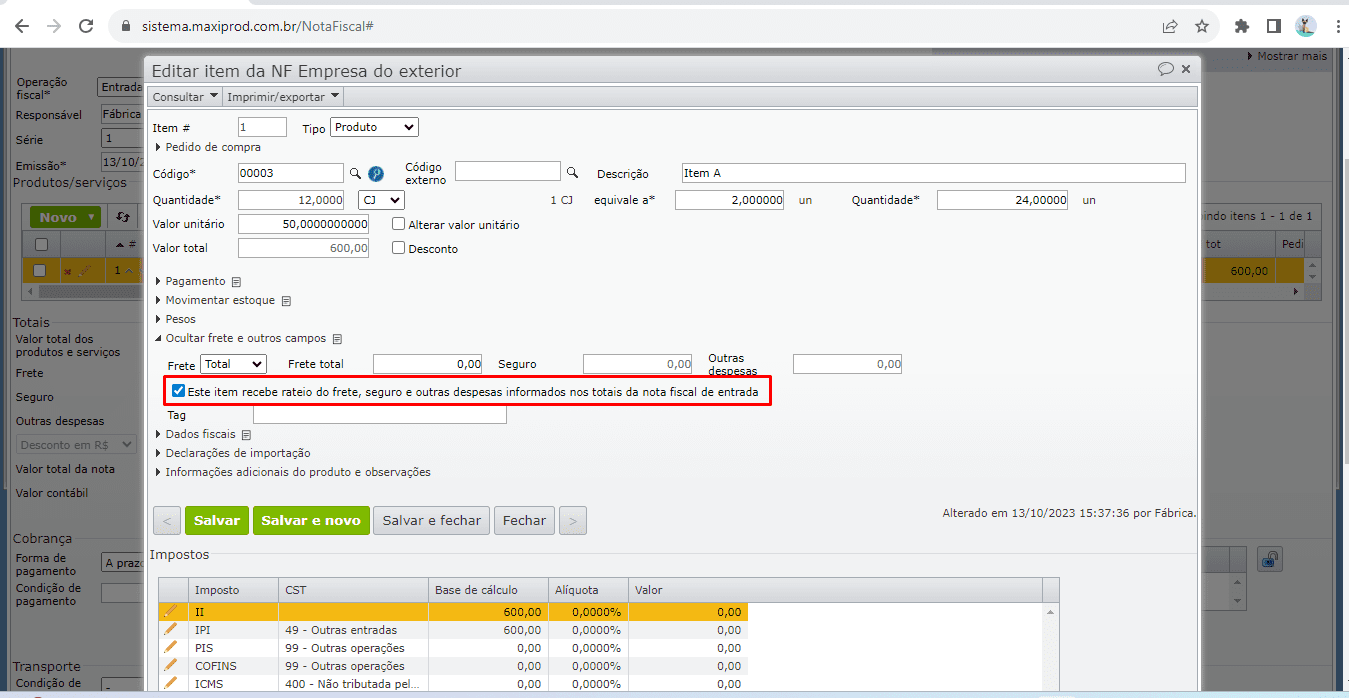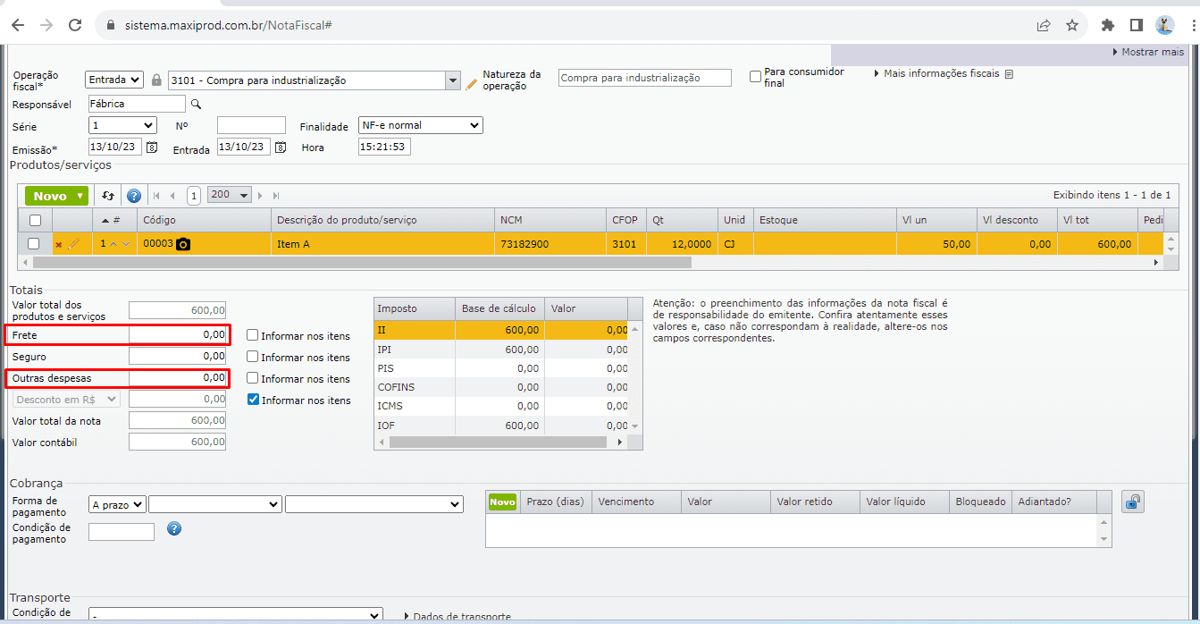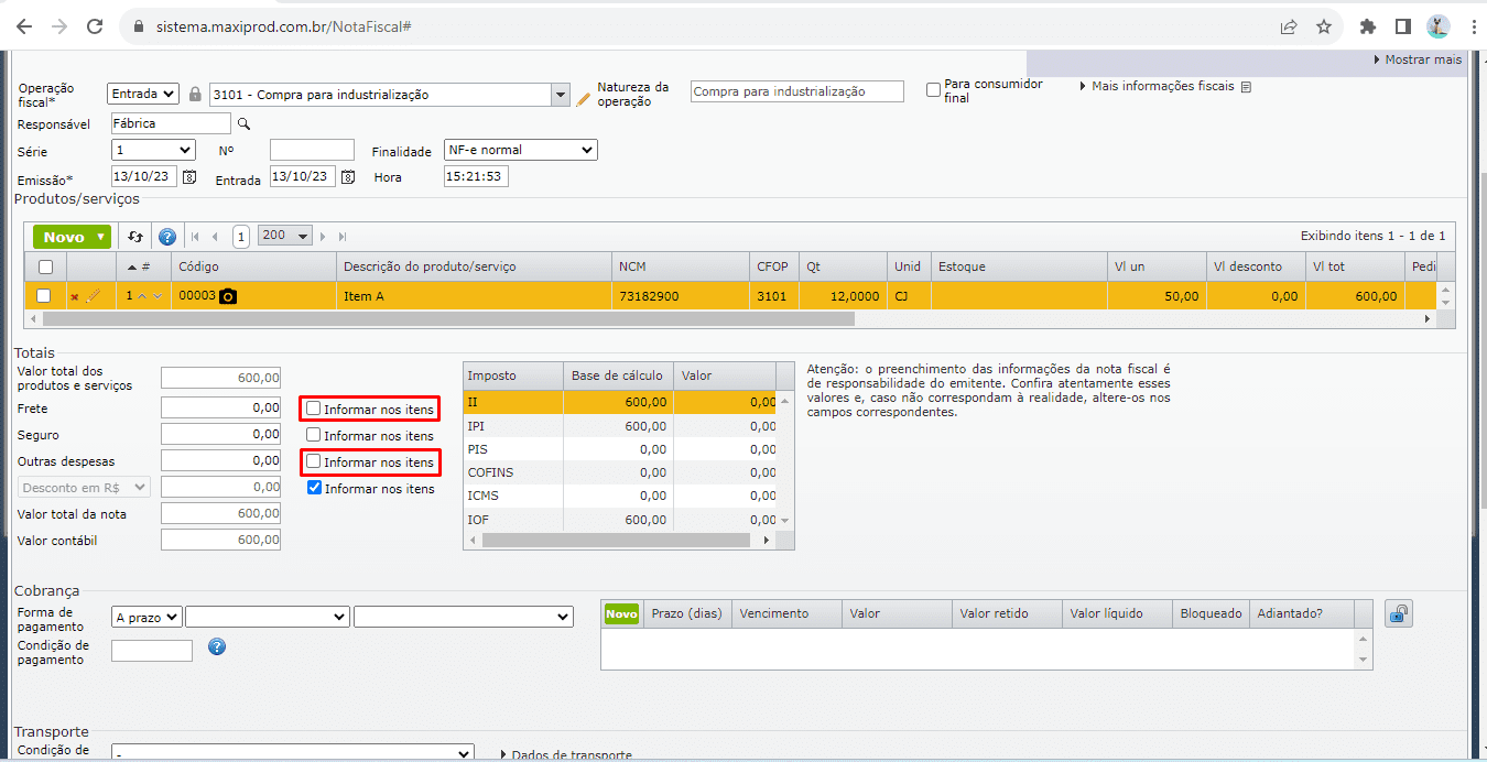 b) Se desmarcada esta opção, os campos “Frete”, “Seguro” e “Outras despesas” do item não terão nenhum valor automaticamente atribuído conforme os totais da nota fiscal. Neste caso, estes campos só serão preenchíveis no item se no respectivo campo dos totais a opção “Informar nos itens” estiver marcada.