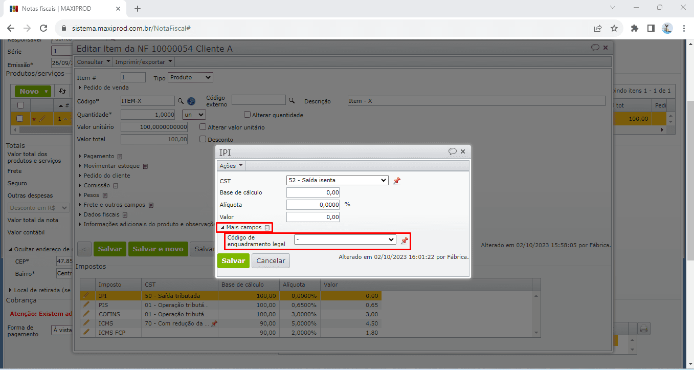 7) Na edição do imposto “IPI”, expanda a aba “Mais campos” e preencha o campo “Código de enquadramento legal”.