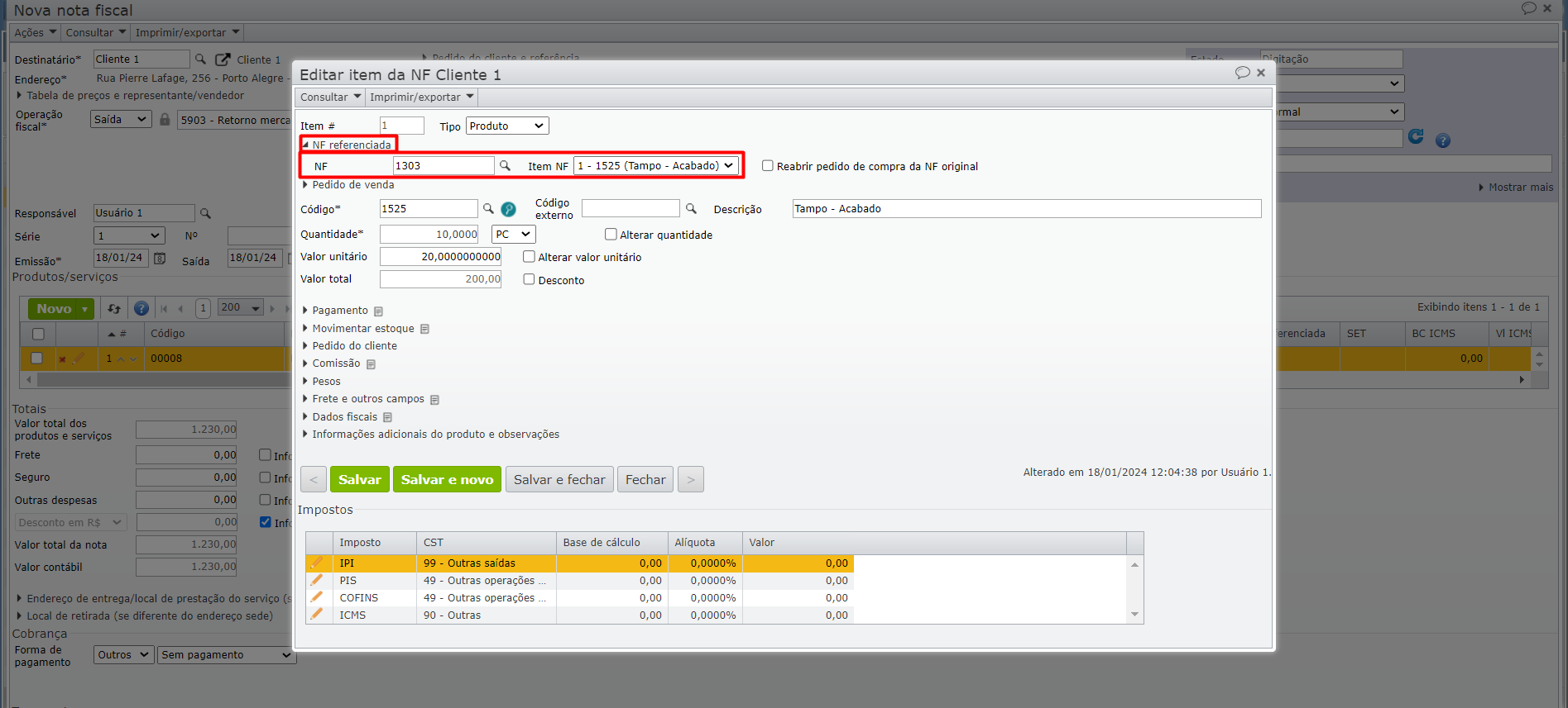 2) A seguir, clique na aba “NF referenciada”, identifique a NF original e selecione o item na mesma.