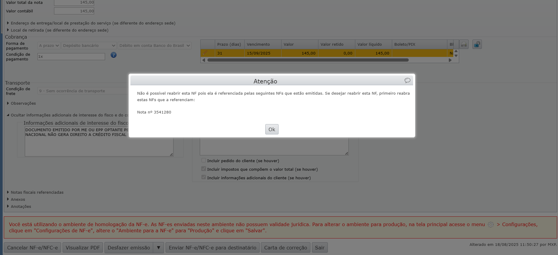 1) Se a nota fiscal que você deseja editar for referenciada por outro documento (ex: uma nota fiscal de devolução), será necessário reabrir primeiro esses documentos referenciadores. Caso contrário, ao tentar desfazer a emissão da nota que irá vincular o pedido, o sistema exibirá a seguinte mensagem de “Atenção”: