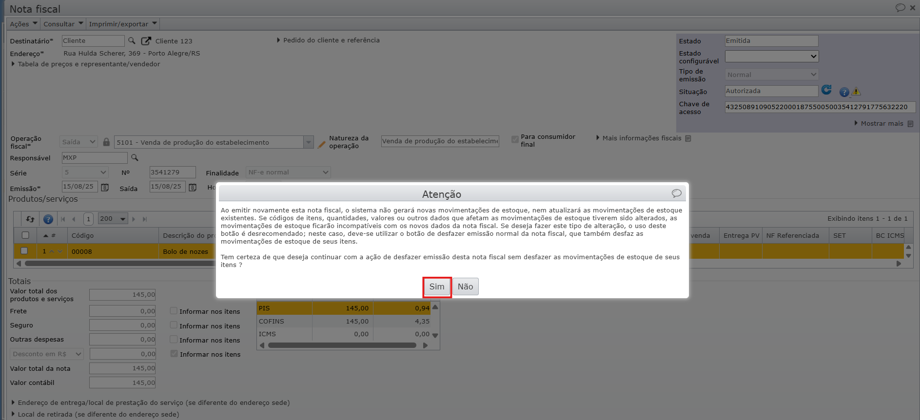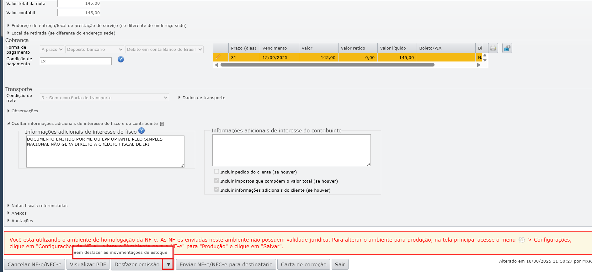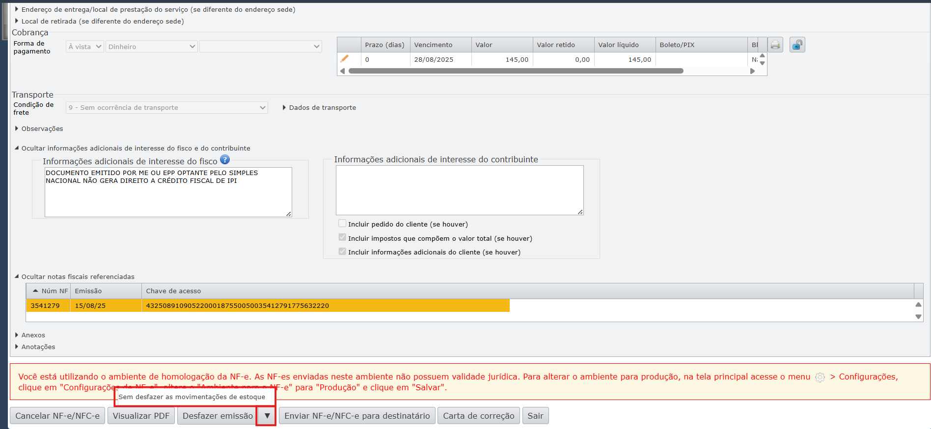 a) Vá até a nota fiscal que referencia a NF que você deseja editar e desfaça a emissão selecionando a opção “Sem desfazer as movimentações de estoque” para manter as movimentações de estoque.