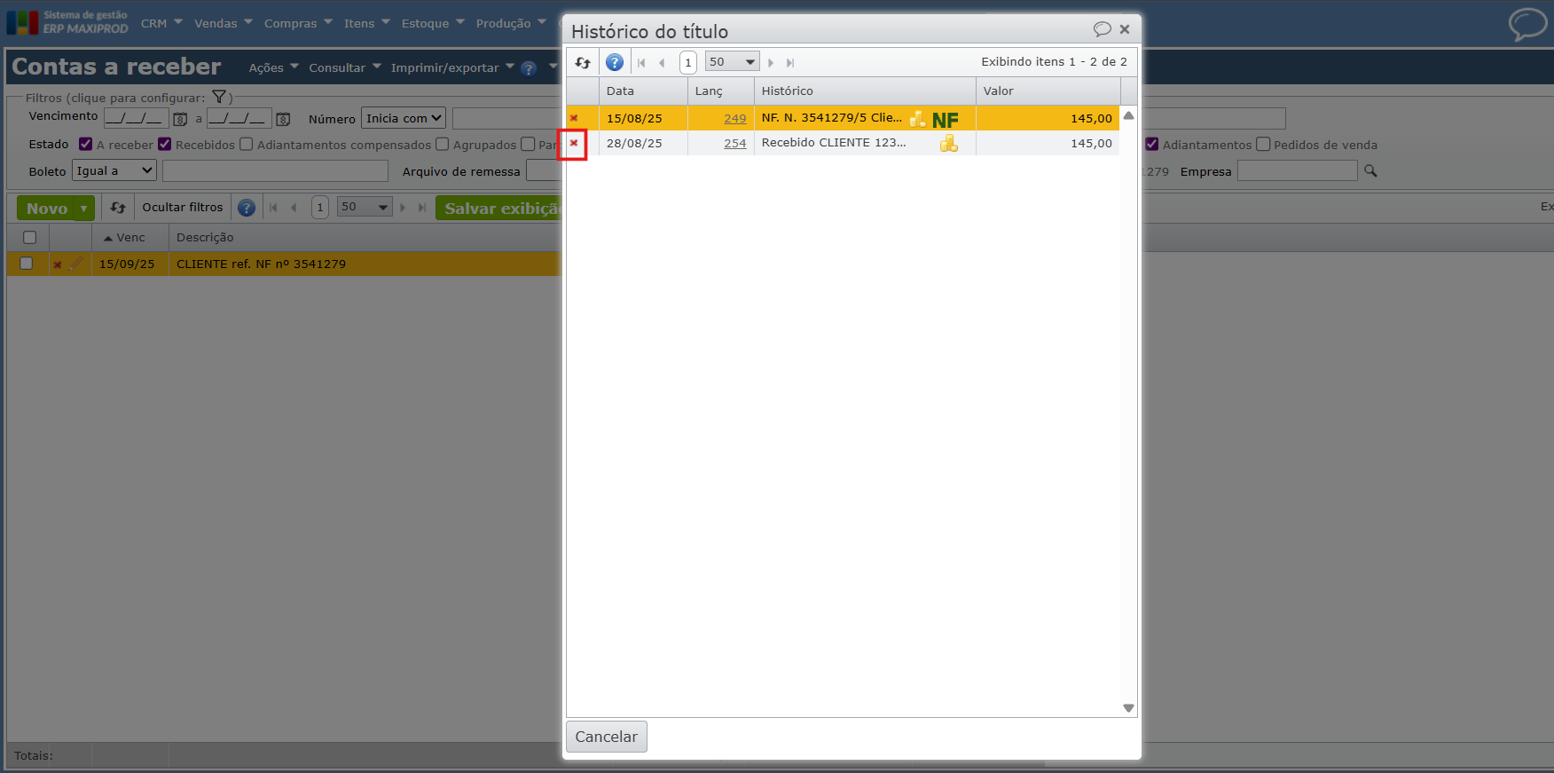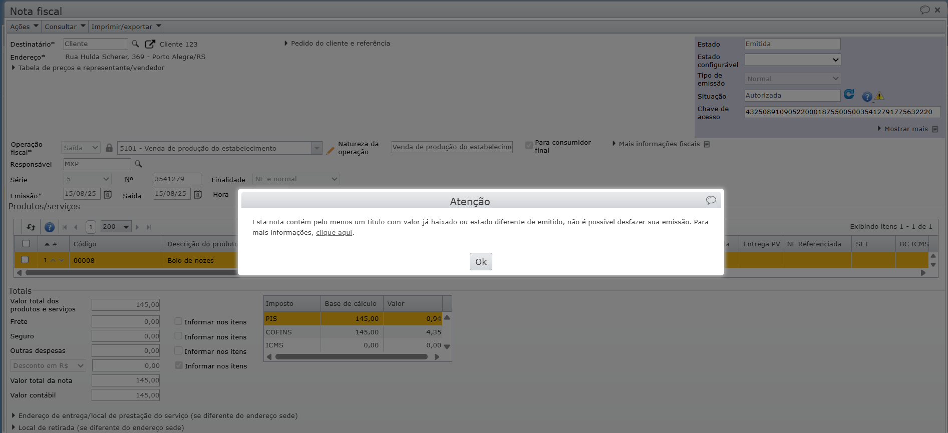 2) Se a nota fiscal teve títulos financeiros gerados e baixados (contas recebidas), será necessário excluir esses pagamentos antes de reabrir a nota fiscal, senão ao tentar desfazer a emissão da nota com o título pago, a mensagem a seguir será retornada.