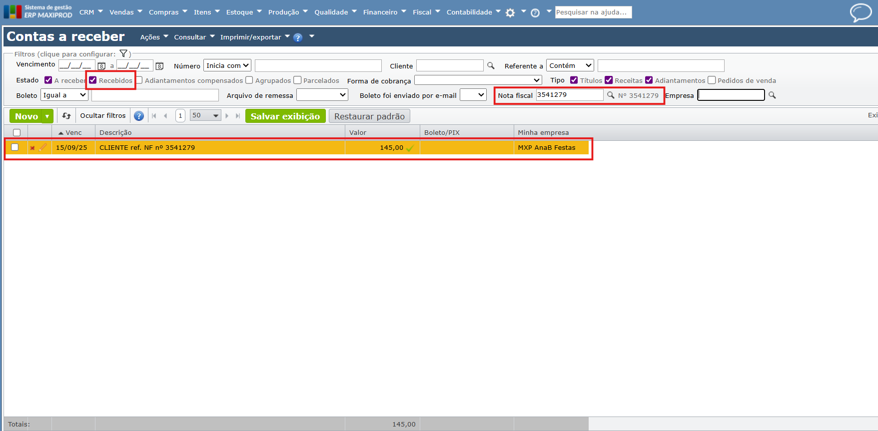a) Acesse o menu “Financeiro > Contas a receber” e localize os títulos gerados pela nota.