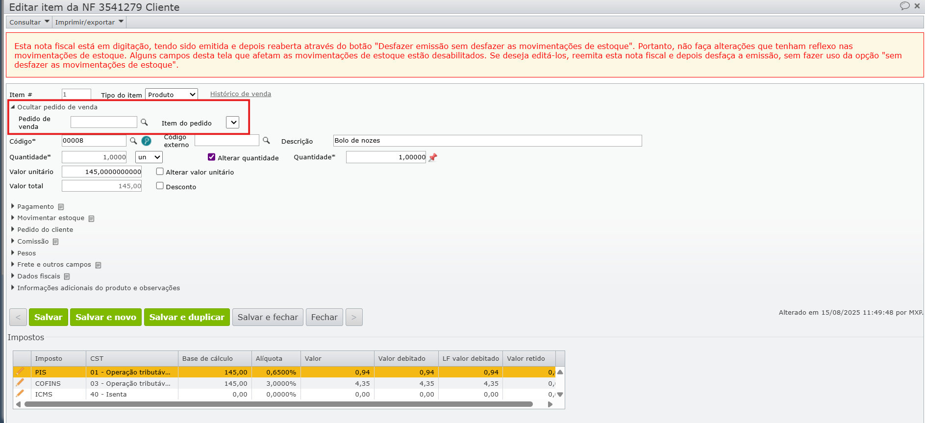 5) Com a nota em estado editável, abra a edição do item através do ícone de lápis e expanda o campo “Pedido de venda”.
